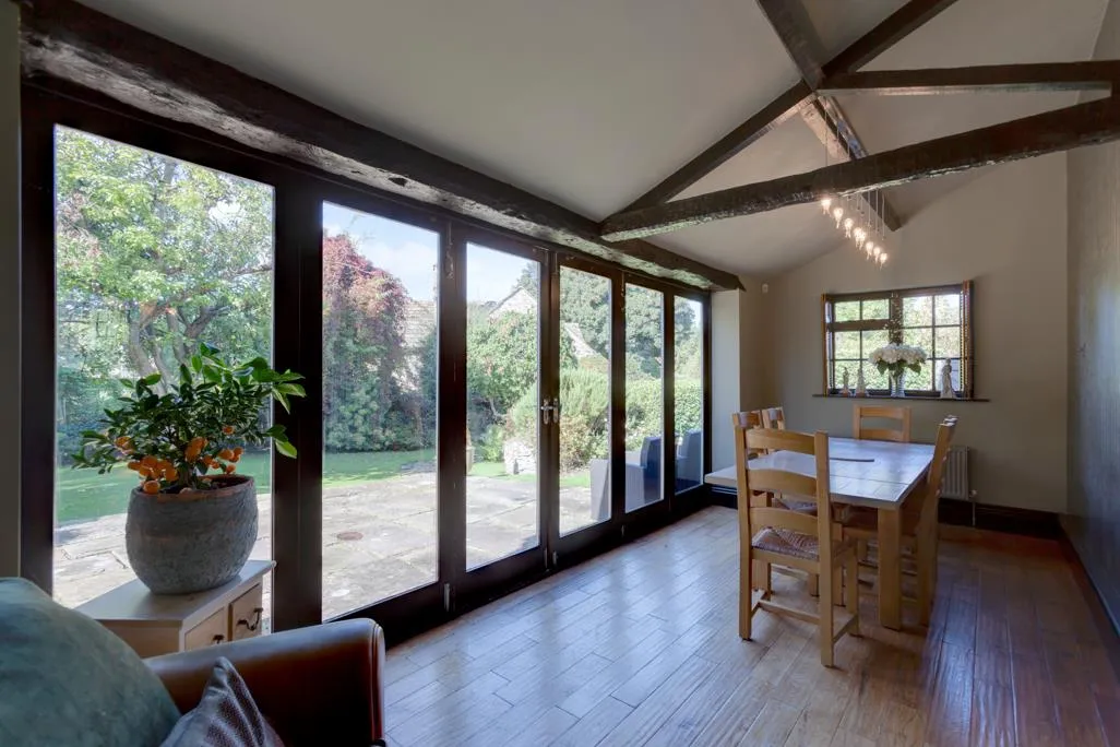 A pleasant room overlooking the rear garden, which is accessed through oak bi-folding doors with double glazed panels. Having a side facing timber glazed window with fitted shutters, exposed timber beams, pendant light point, central heating radiators and oak flooring. A timber door opens to the office.