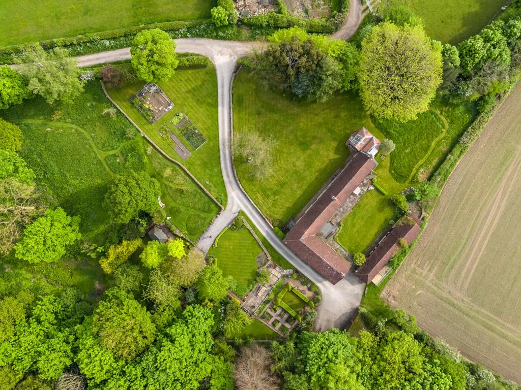 There is a public footpath that leads over the driveway and to the left of the triple garaging down into woodland.