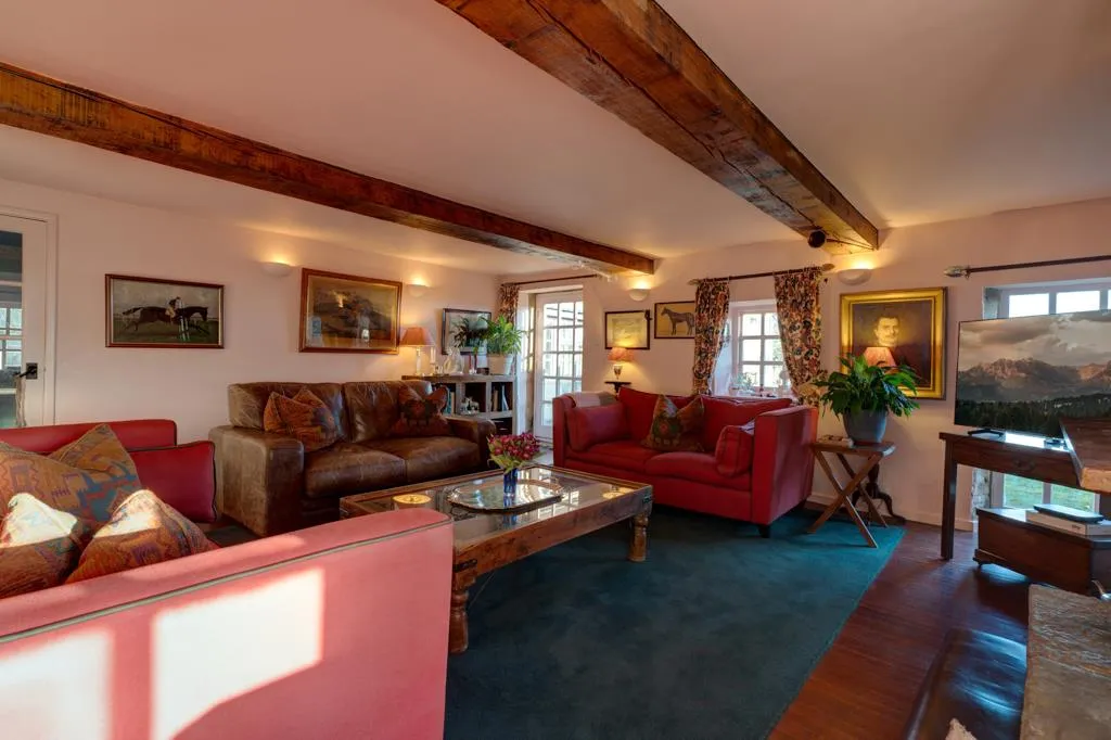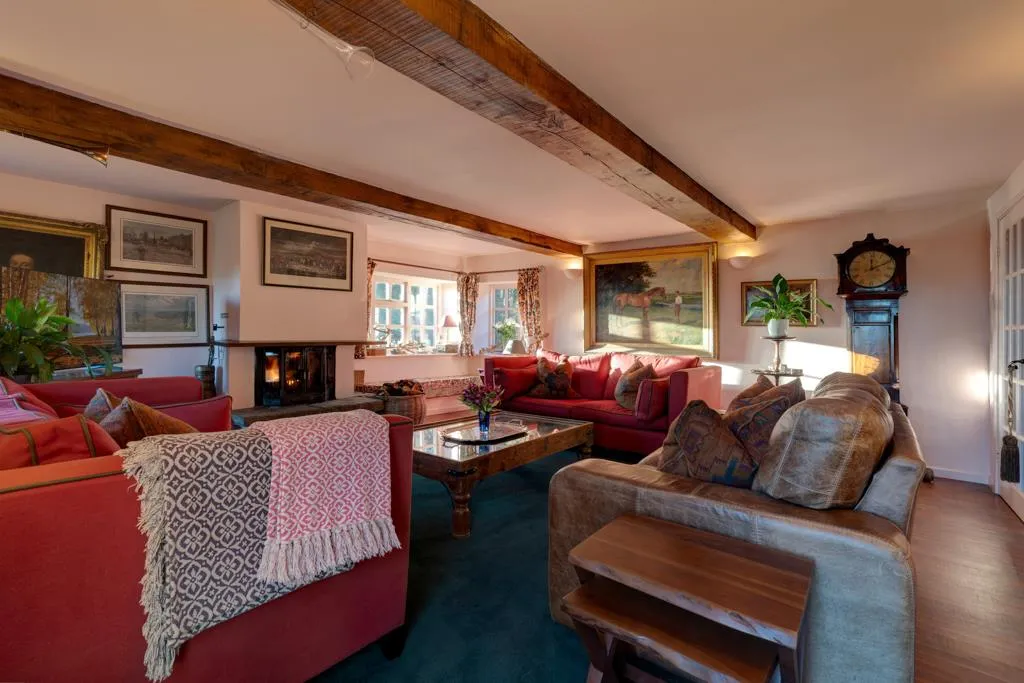 One of the main reception rooms is the homely lounge with its exposed wooden beams, traditional small pane windows and multi-fuel burner. Presenting the perfect space to cater for the family is the breakfast kitchen, which features an Aga range cooker and has ample space for a sizeable dining table. There is also a large formal dining room with a breakfast area to one corner, making it ideal for entertaining or everyday living. Additionally, to the far left of the farmhouse is another kitchen and reception room. Across the entirety of the first floor, there are six generously sized bedrooms, two of which have vaulted ceilings, and the sixth bedroom that is currently utilised as an office.