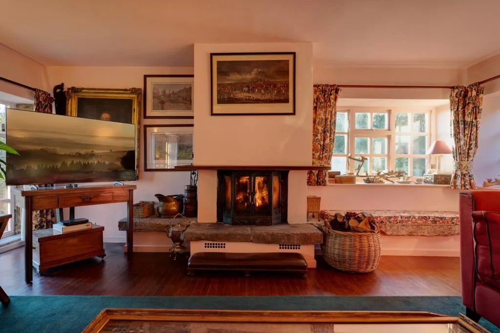 A homely reception room with rear and side facing hardwood double glazed windows, exposed wooden beams, wall mounted light points, central heating radiators, TV/aerial point and timber flooring. The focal point of the room is the multi-fuel burner with an oak mantel and a stone hearth, which extends into a window seat. A hardwood door with double glazed panels opens to the rear of the property.