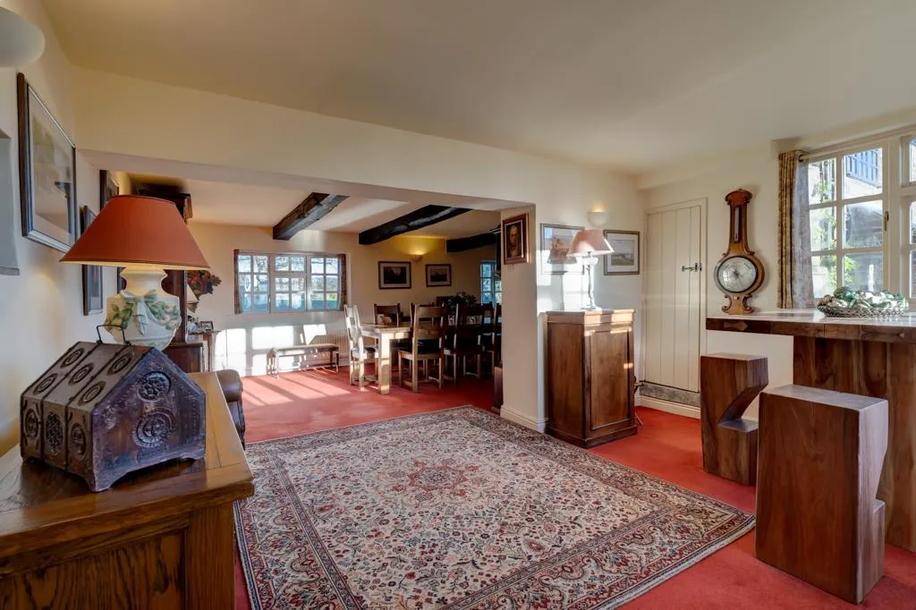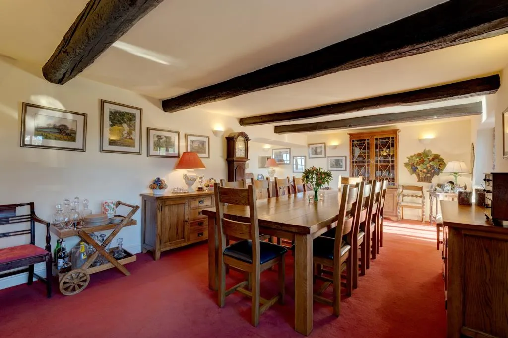 A large formal dining room that is ideal for entertaining family and friends. Having front, side and rear facing hardwood double glazed windows, exposed wooden beams, wall mounted light points and central heating radiators. There is a useful storage cupboard with a pendant light point and shelving. A timber door with glazed panels opens to a second entrance hall.