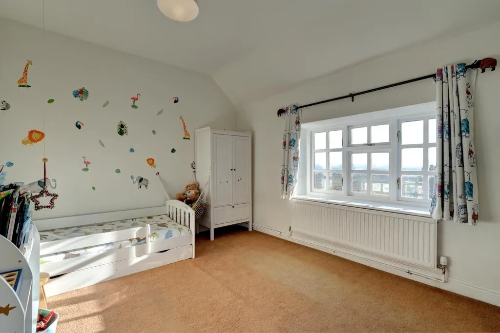 An exceptionally spacious master bedroom with an impressive vaulted ceiling and exposed wooden beams. Having side facing hardwood double glazed windows, side facing glazed panels, feature spotlights on the beams, central heating radiators, telephone point and timber flooring. To one wall, there is a range of fitted furniture that incorporates long hanging.