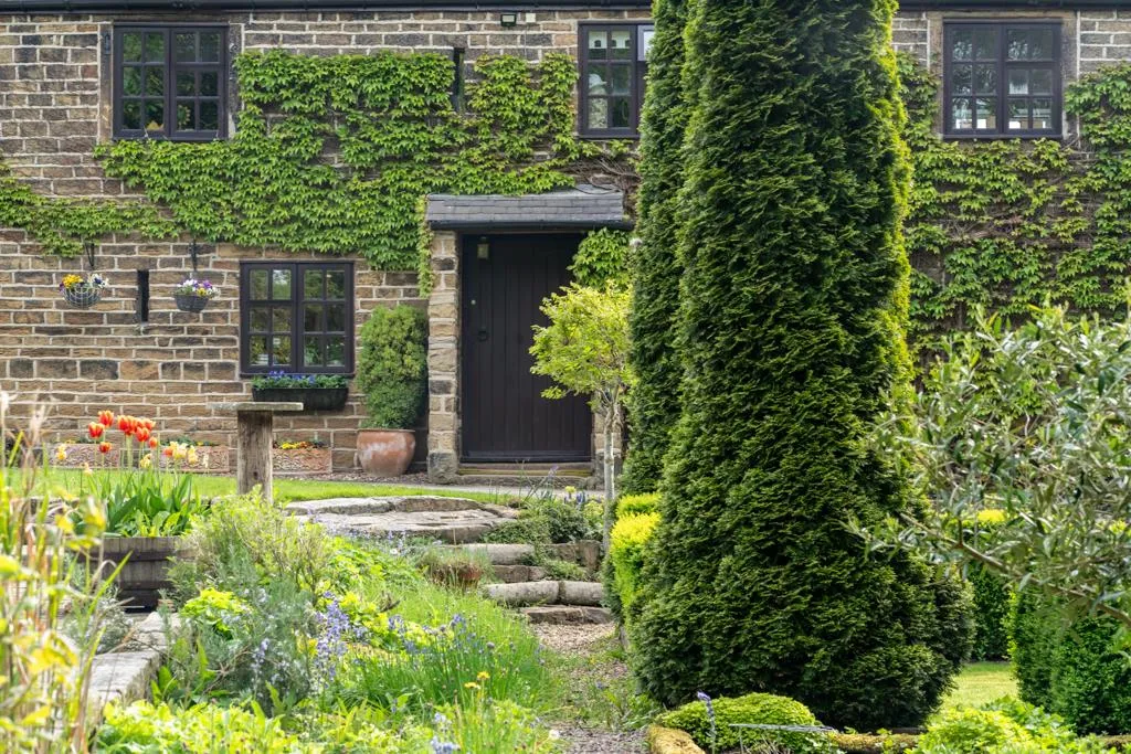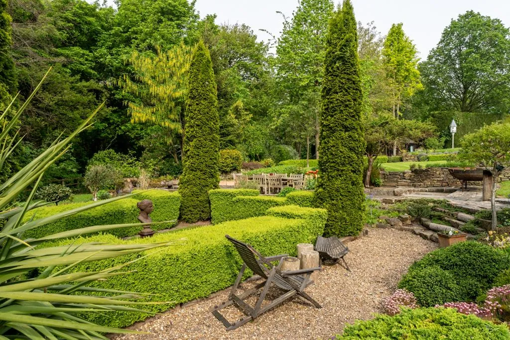 To the right side of the driveway, there is a vegetable patch that is surrounded by lawn and incorporates raised planters. From the vegetable patch, a gap within a dry-stone wall gives access to a large open green area with mature trees.