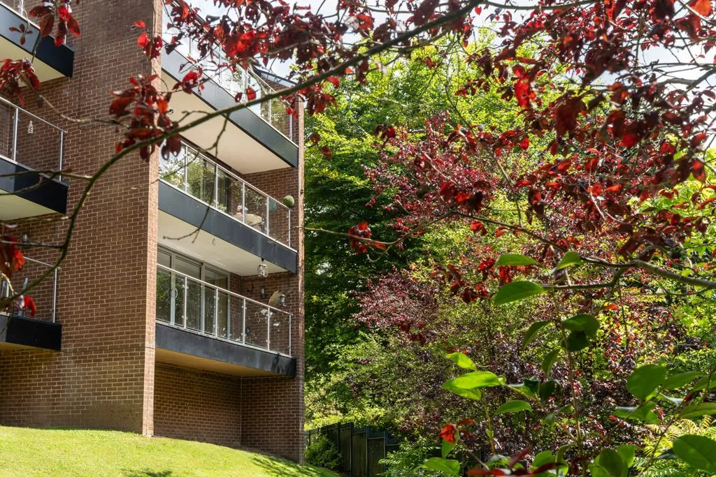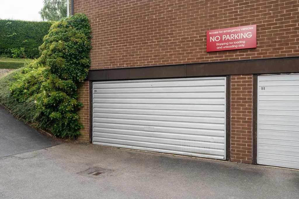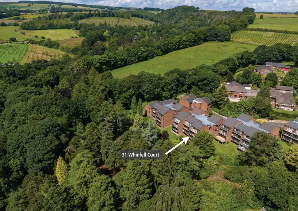 To the front of the apartment block, there is an area for temporary parking and further up the road there is a visitors car park. Stone steps lead down to the apartment building. To the front, there are mature shrubs and a path gives access to the communal entrance door. Also accessible from Whinfell Court is the double garage, which belongs to number 31 and is labelled number 10.