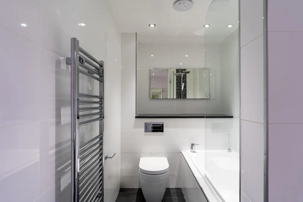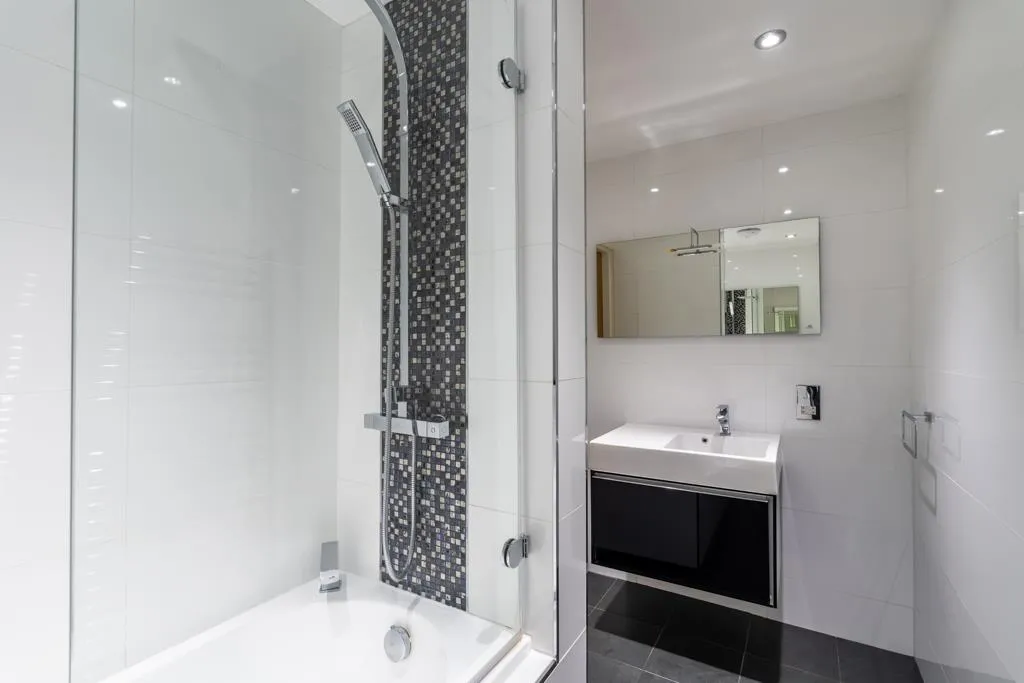 Being fully tiled and having recessed lighting, an extractor fan, a chrome heated towel rail, a mirrored storage cabinet and a shaver point. There is a NK Porcelanosa suite in white, which comprises of a low-level WC and a wall mounted wash hand basin with a chrome mixer tap. To one wall, there is a walk-in shower enclosure with a fitted Porcelanosa rain head shower, an additional hand shower facility and a glazed screen.