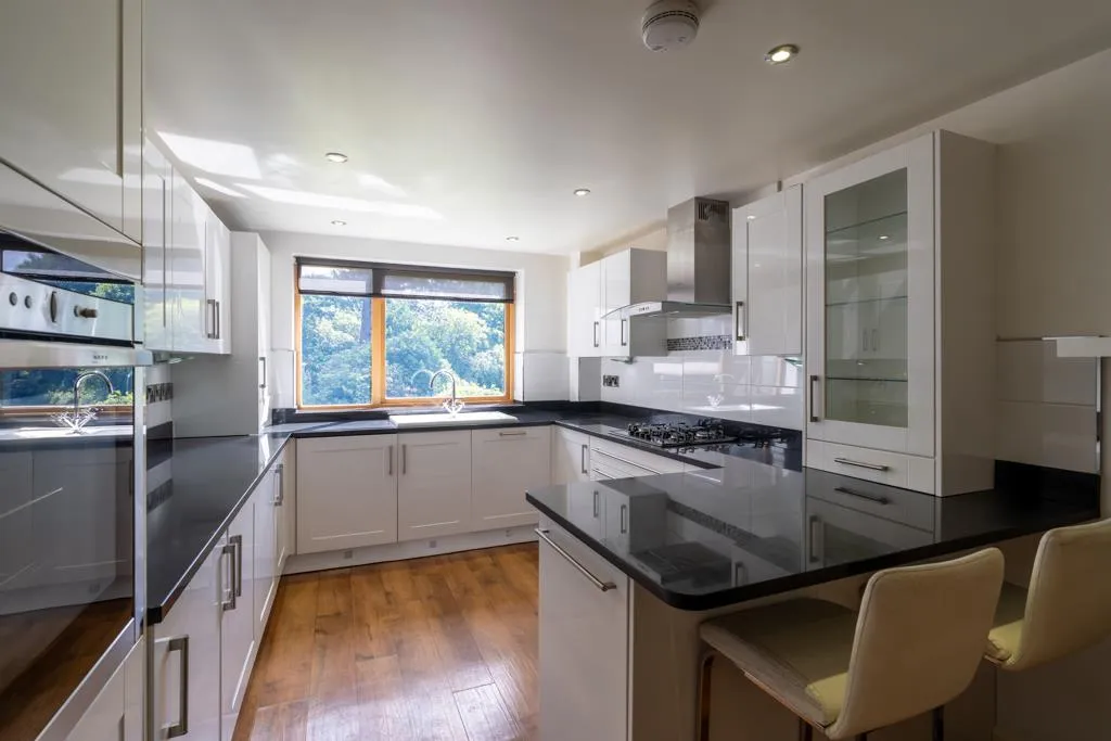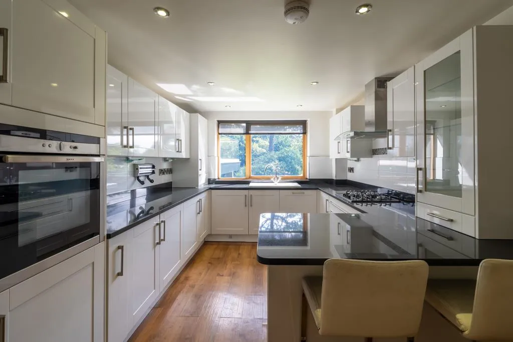A bright breakfast kitchen enjoying wonderful views across mature greenery. Having a side facing timber double glazed window and a side facing obscured glazed interior panel. Also having recessed lighting, a central heating radiator, TV/aerial cabling and engineered oak flooring. There is a range of fitted base/wall and drawer units, incorporating matching granite work surfaces, upstands, tiled splash backs, under-counter and plinth lighting and an inset 1.0 bowl sink with a chrome mixer tap and a WasteMaid food waste disposal. The work surface extends to provide breakfast seating and a cupboard houses the Vaillant boiler. The integrated appliances include a Neff four-ring gas hob with a Neff extractor hood above, Neff fan assisted oven, Neff compact oven, Neff warming drawer, Bosch under-counter fridge, Bosch under-counter freezer, John Lewis washing machine and a Neff dishwasher.