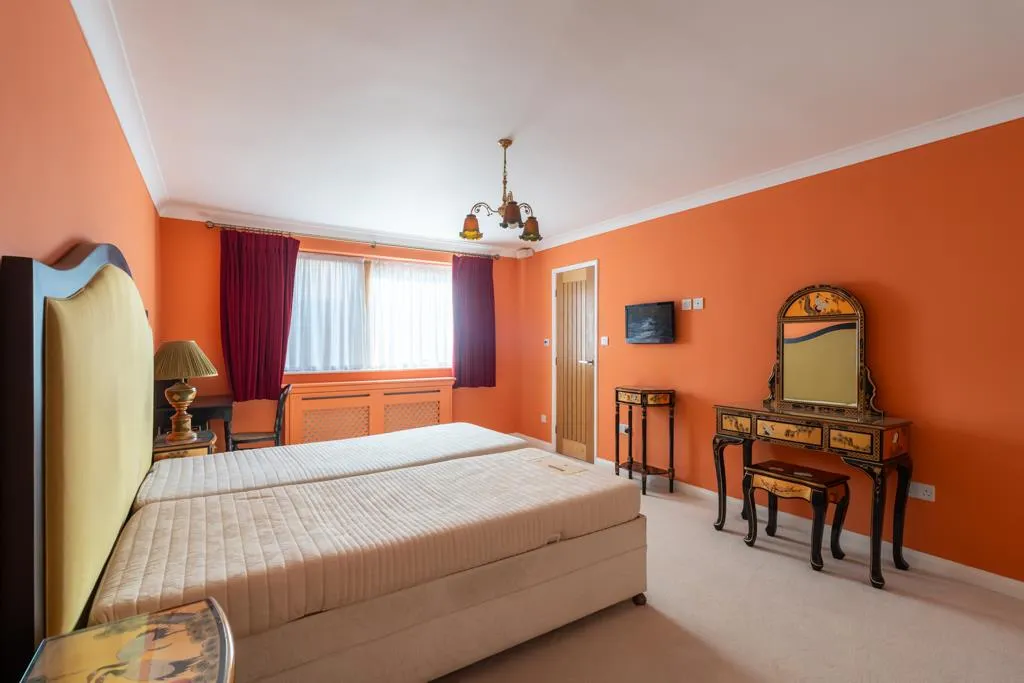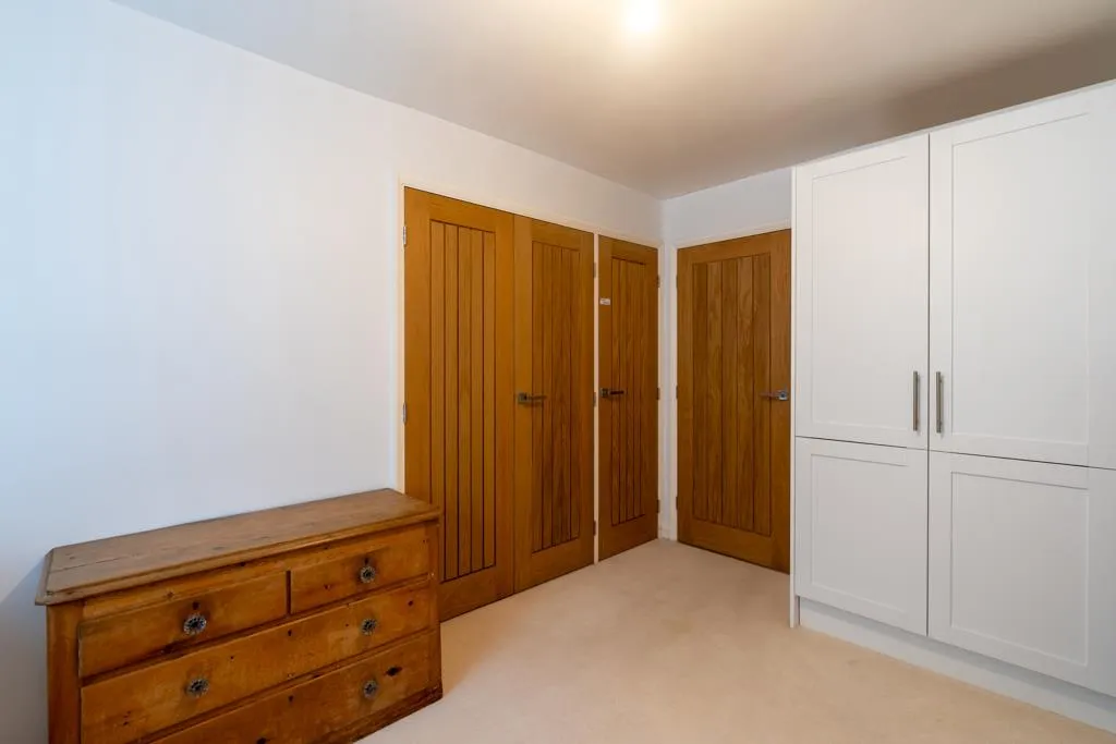 Having a front facing timber double glazed window, pendant light point, TV/aerial point and a telephone point. There is a range of fitted furniture, incorporating shelving and drawers. Double oak doors and a separate oak door open to built-in wardrobes that contain shelving.