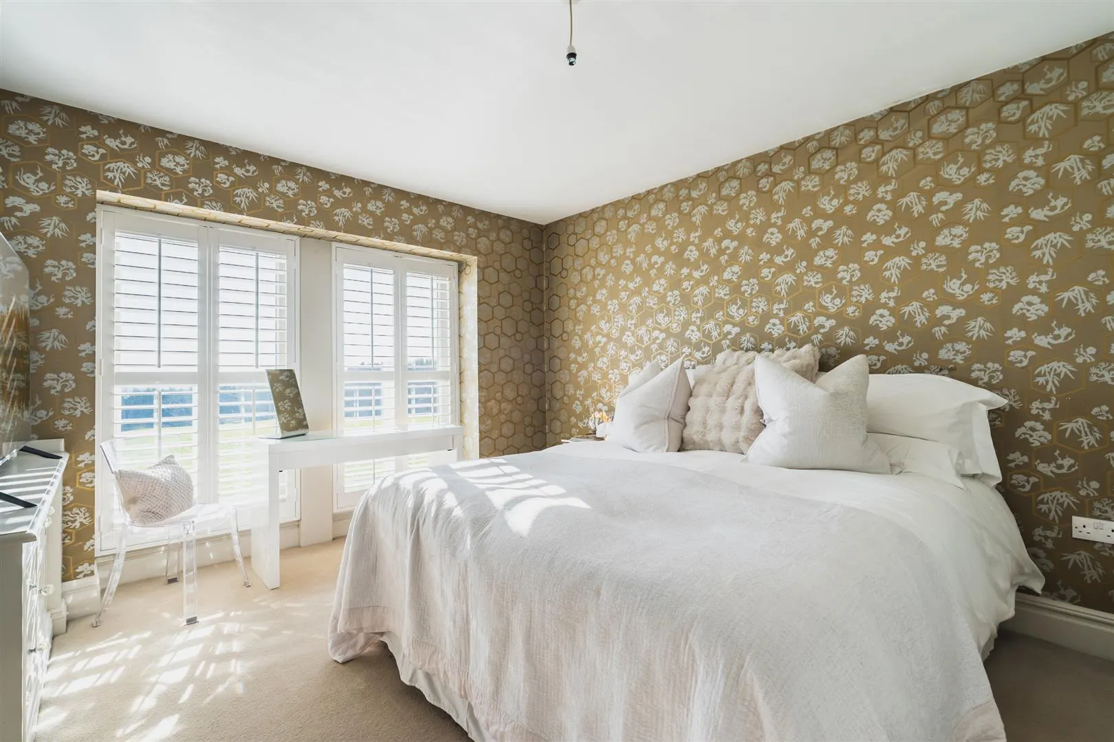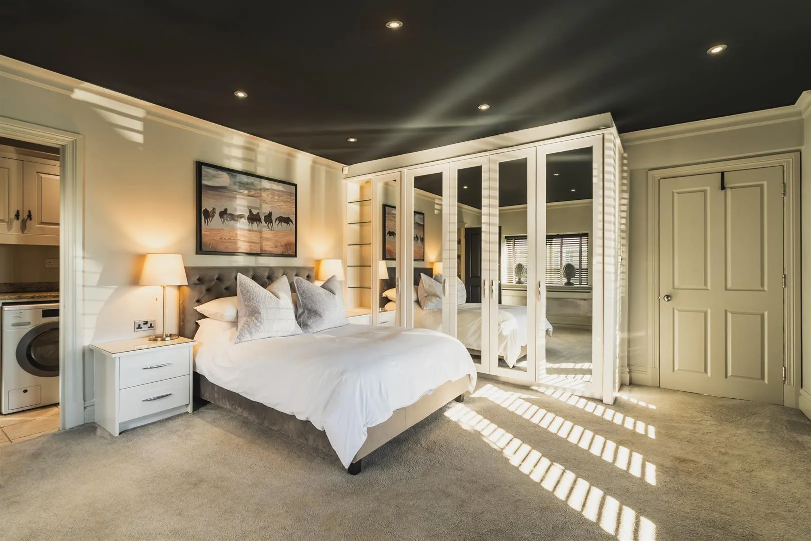 A fabulous double bedroom with front and side facing hardwood double glazed windows, coved ceiling, recessed lighting and central heating radiators with decorative covers. There is a range of fitted furniture, incorporating long hanging, shelving and drawers. A timber door opens to the utility room.