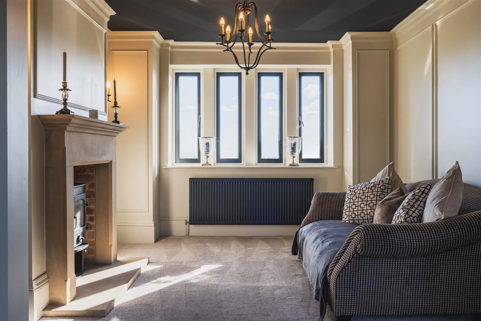 A fabulous reception room featuring decorative dado panelling to each of the walls. Having front facing hardwood double glazed windows, coved ceiling, pendant light point, wall mounted light points, central heating radiator, TV/aerial cabling and deep skirtings. The focal point of the room is the sandstone fireplace with a log burner, mantel and hearth.