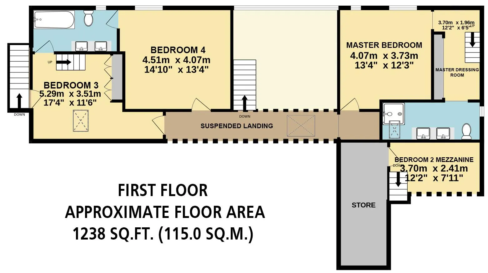 On the first floor: Suspended landing, bedroom 2 mezzanine, eaves storage, master bedroom, master dressing room, master en-suite, bedroom 4, Jack-and-Jill en-suite and bedroom 3.