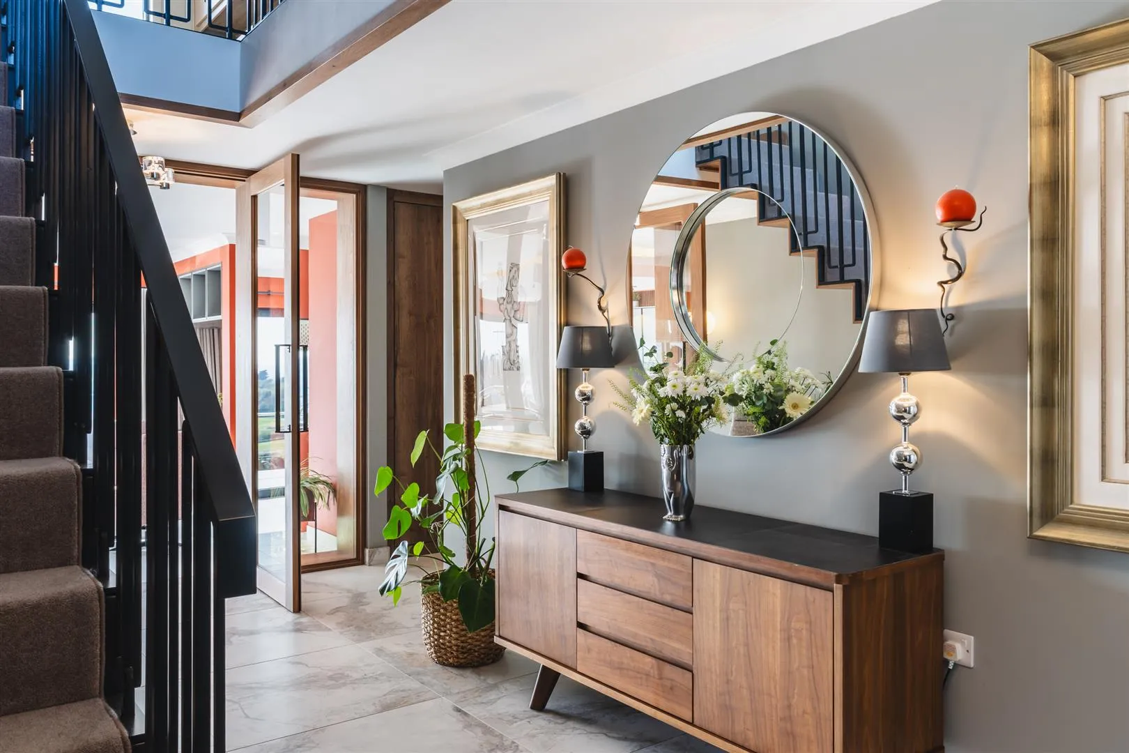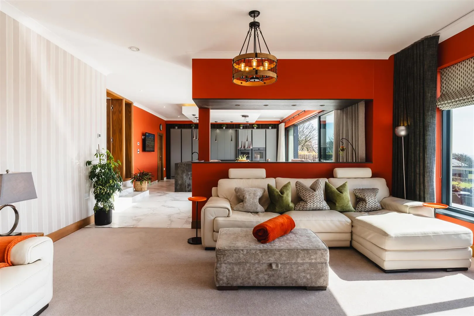 A wonderful reception room with a rear facing aluminium/pine triple glazed panel, coved ceiling, pendant light points and under floor heating. To one wall, there is a feature media wall, incorporating decorative panelling, wall mounted light points, provision for a wall mounted television and an electric log effect fire.
