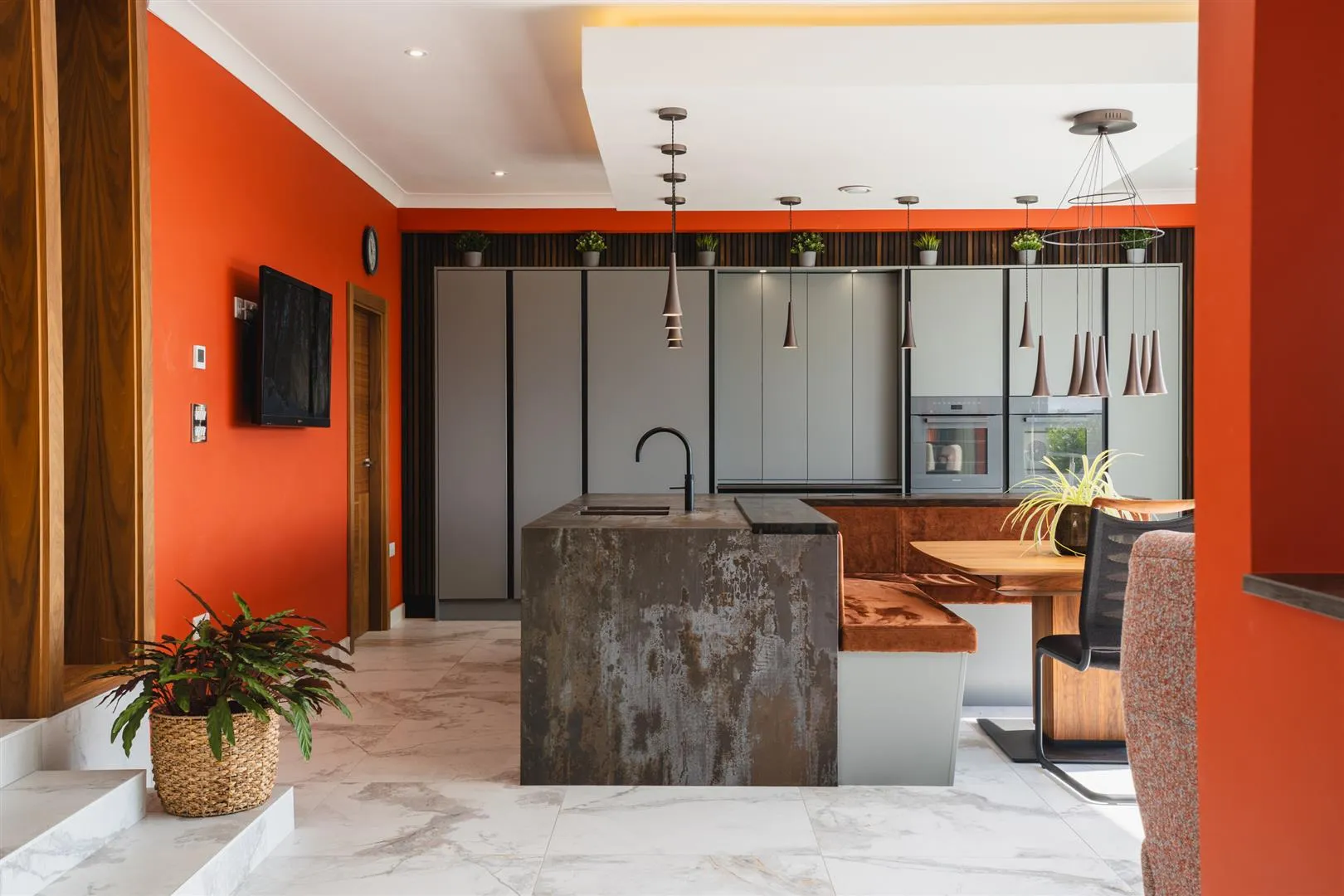 A stunning dining kitchen that is flooded with natural light and has been finished to an exceptional standard. Having a triple glazed roof window, coved ceiling, recessed lighting, pendant light points, MHVR vent, TV/aerial/data point and tiled flooring with under floor heating. There is a range of fitted base/wall and drawer units, incorporating matching work surfaces. The centrepiece of the kitchen is the island, which provides additional storage and has a matching work surface and two inset 1.0 bowl sinks with a Quooker boiling tap. Attached to the island is an upholstered dining bench. Appliances include a Bora induction hob with a downdraft extractor fan, two Miele fan assisted ovens, one being a steam oven, two deep Miele warming drawers, a Miele dishwasher and a full-height 760mm wide Miele fridge. Double sliding aluminium/pine doors with triple glazed panels and matching side panels open to the rear seating terrace. A door opens to the utility room and a wide opening gives access to the lounge.