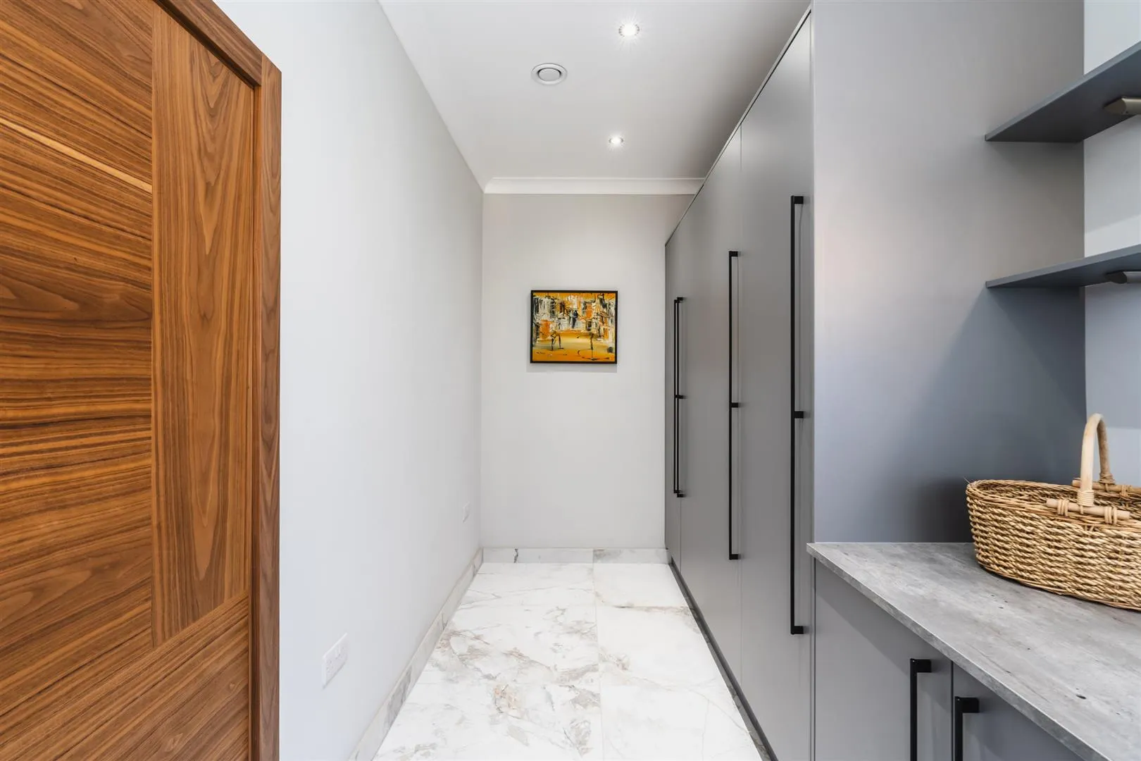 Having a coved ceiling, recessed lighting and tiled flooring with under floor heating. To one wall, there is a range of fitted furniture, incorporating short/long hanging and shelving. A door opens to the integral six-car garage and a further door leads to a shower room.