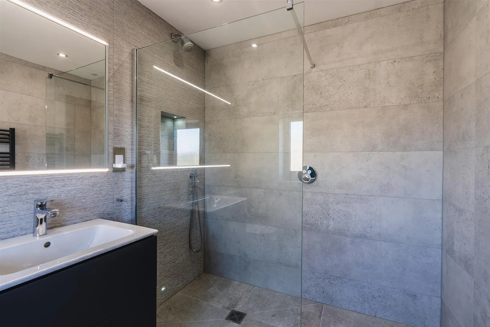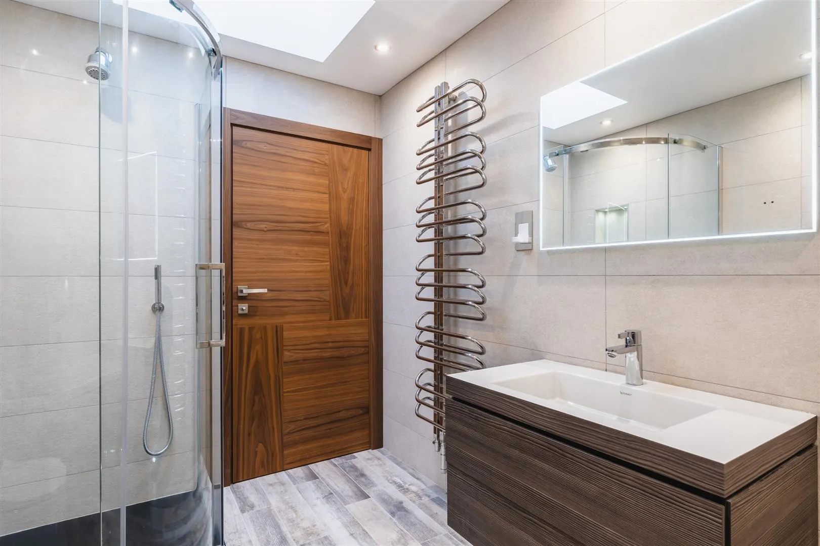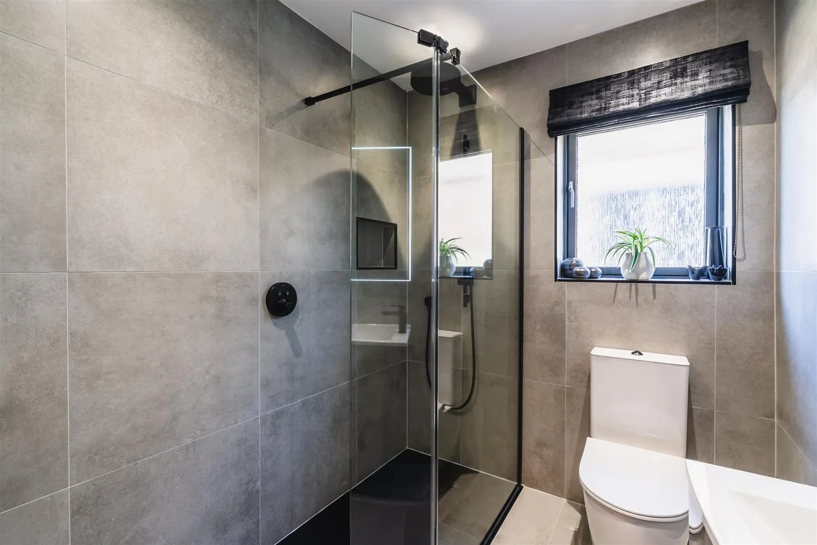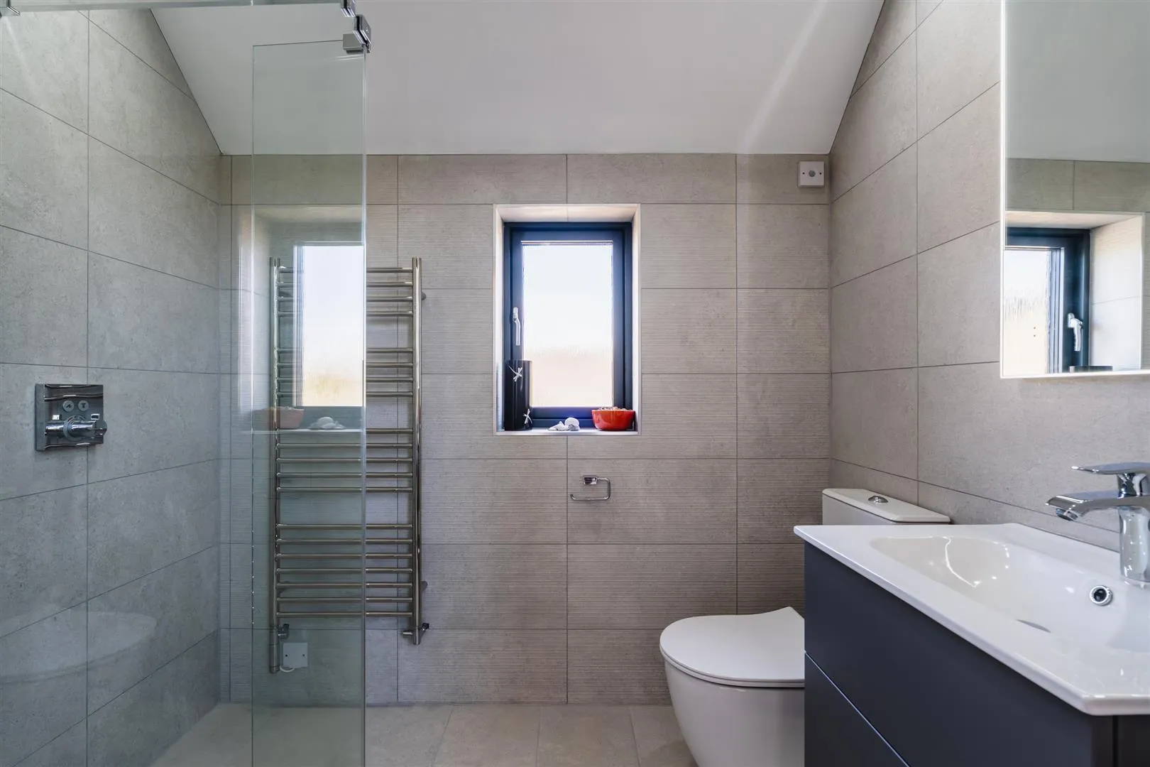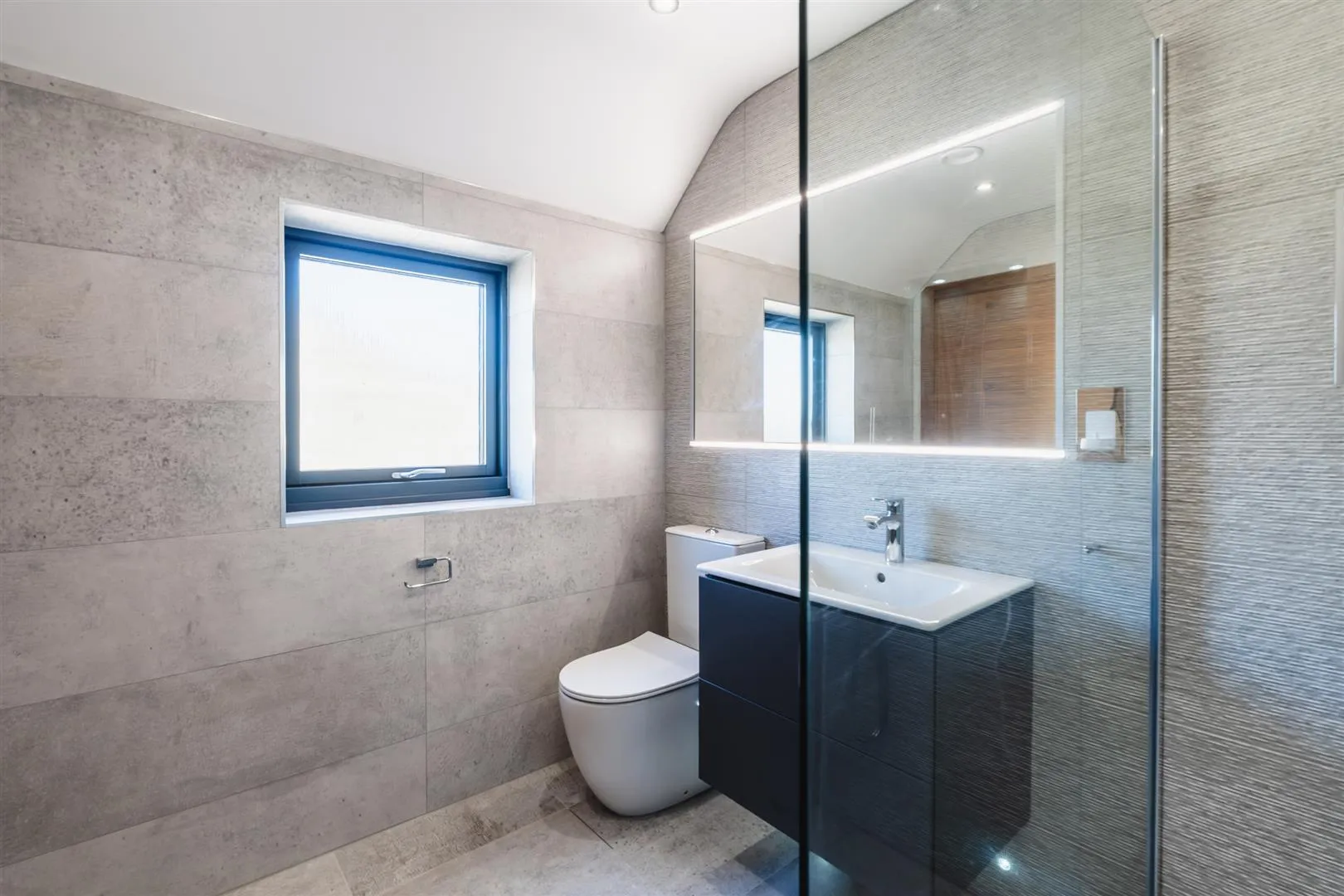 Being fully tiled and having a side facing aluminium/pine triple glazed obscured window, recessed lighting, MHVR vent, chrome heated towel rail, illuminated vanity mirror and a toothbrush charger point. There is a suite in white, which comprises of a Vitra low-level WC and a wash hand basin with a Hansgrohe chrome mixer tap and storage beneath. To one wall, there is a walk-in shower enclosure with a fitted Hansgrohe shower, an additional hand shower facility, a recessed tiled shelf with automatic lighting and a glazed screen.