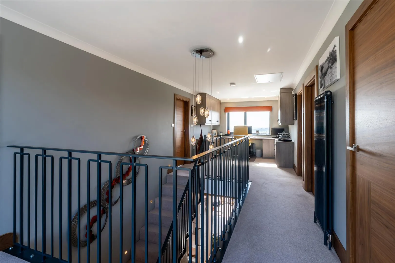 A large landing that is well-appointed with fitted office furniture. Having a front facing aluminium/pine triple glazed panel, rear facing aluminium/pine triple glazed window, coved ceiling, feature pendant light points, recessed lighting and central heating radiators. The study area comprises a range of fitted furniture, including a desk and cupboards. Access can be gained to the loft space. Doors open to the master bedroom, bedroom 2, family bathroom, storage cupboard, bedroom 3 and bedroom 4.