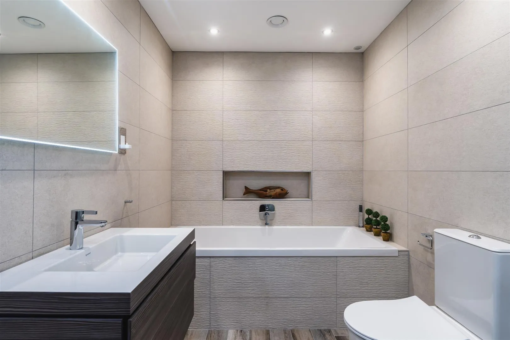 A modern family bathroom that is fully tiled and has a Velux roof window with remote opening facility, recessed lighting, MHVR vent, chrome heated towel rail, illuminated vanity mirror and two toothbrush charger points. There is a suite in white, which comprises of a Vitra low-level WC and a wall mounted Duravit wash hand basin with a Hansgrohe chrome mixer tap and storage beneath. Also having a Duravit panelled bath with a Hansgrohe chrome mixer tap and a pencil shower attachment, a recessed tiled shelf above with automatic recessed lighting. To one corner, there is an Acquabella shower enclosure with a fitted Hansgrohe shower, a recessed tiled shelf with automatic lighting and a glazed screen/door.