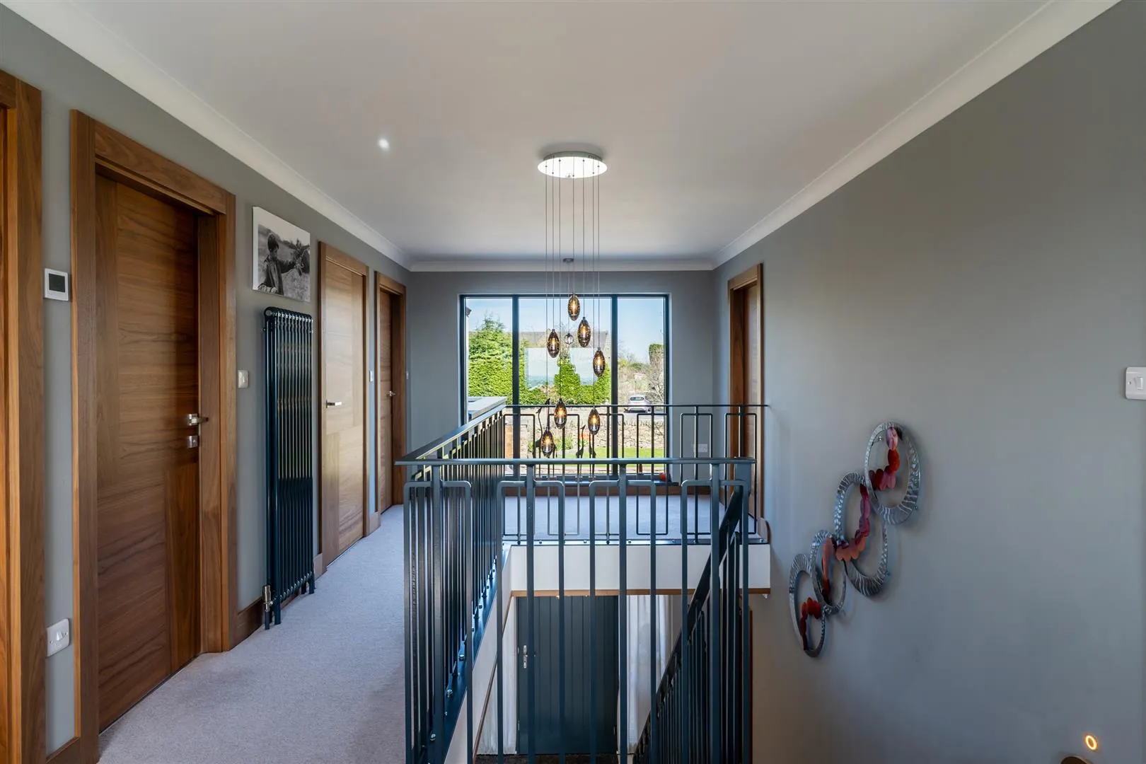 A walnut staircase with steel balustrading rises to the first floor, where a sizeable landing contains a study area and connects to each of the bedrooms and well-appointed family bathroom. All of the bedrooms are generously proportioned and include a luxurious master bedroom suite, two further suites and a superb double bedroom.