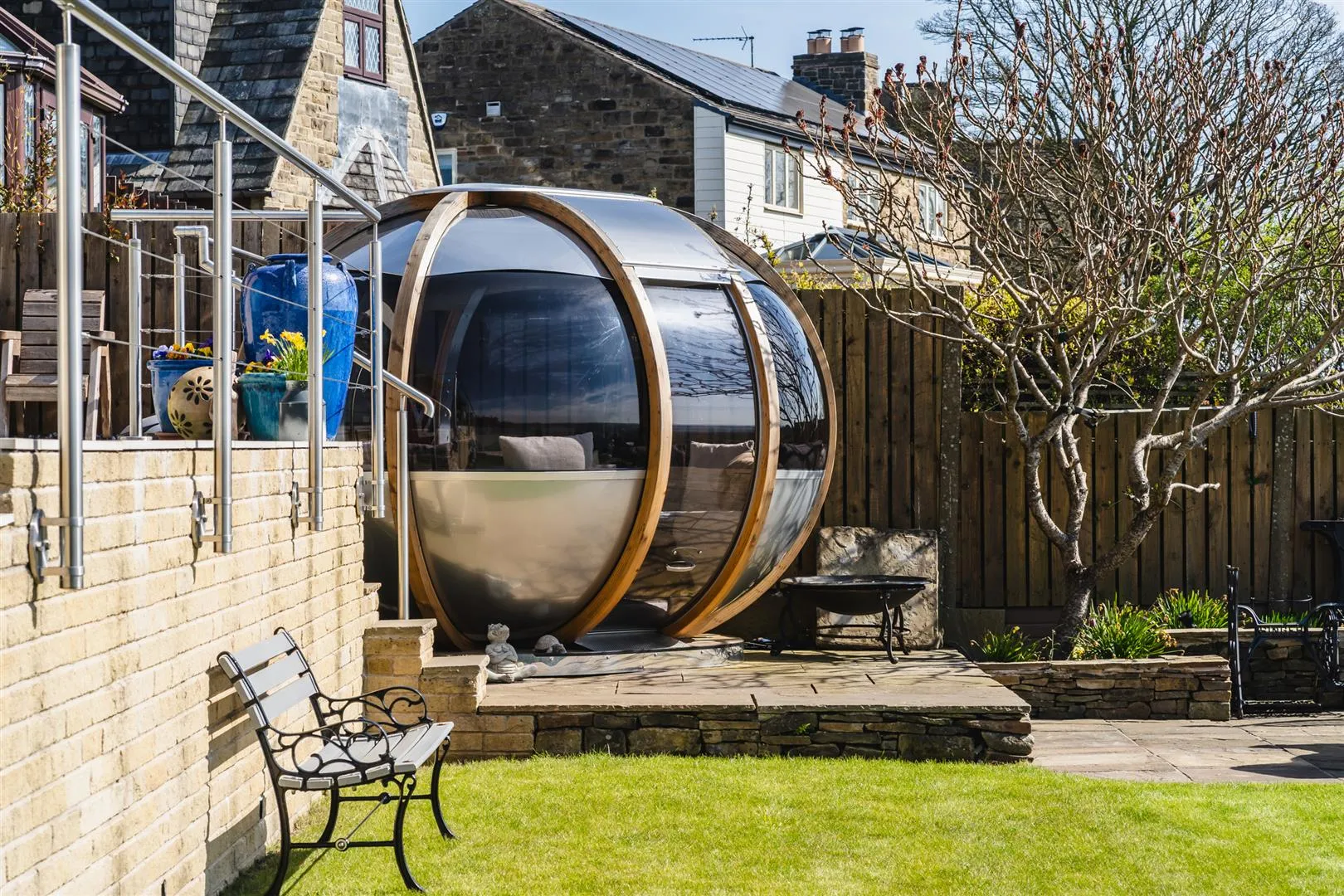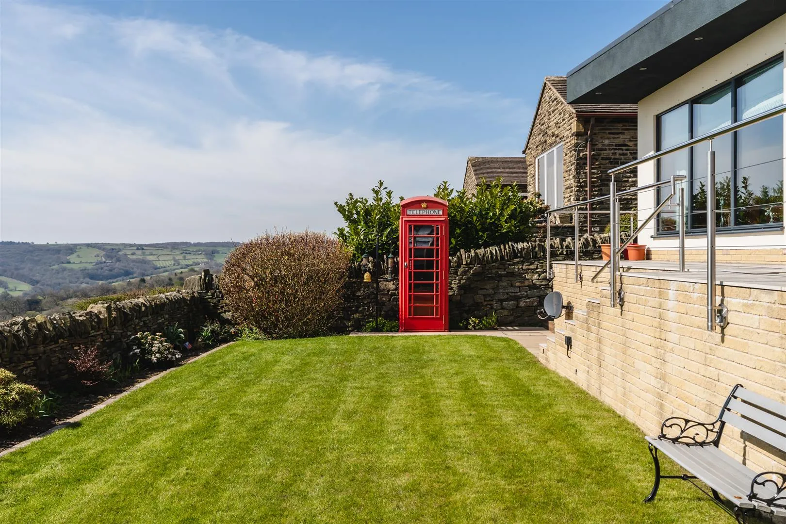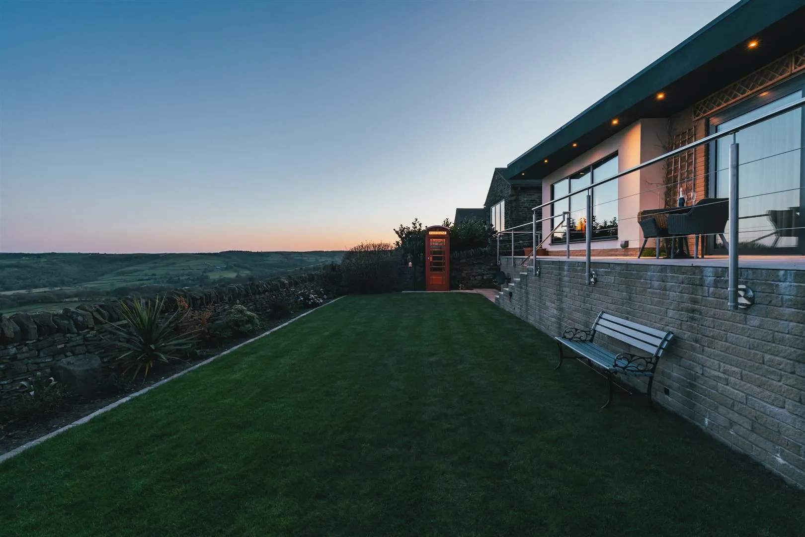 Two separate sets of steps lead down to the garden, which is mainly laid to lawn and has mature planted borders. To one corner of the garden there is a stone flagged patio with a raised stone planter and providing a wonderful vantage point over the rolling countryside.
