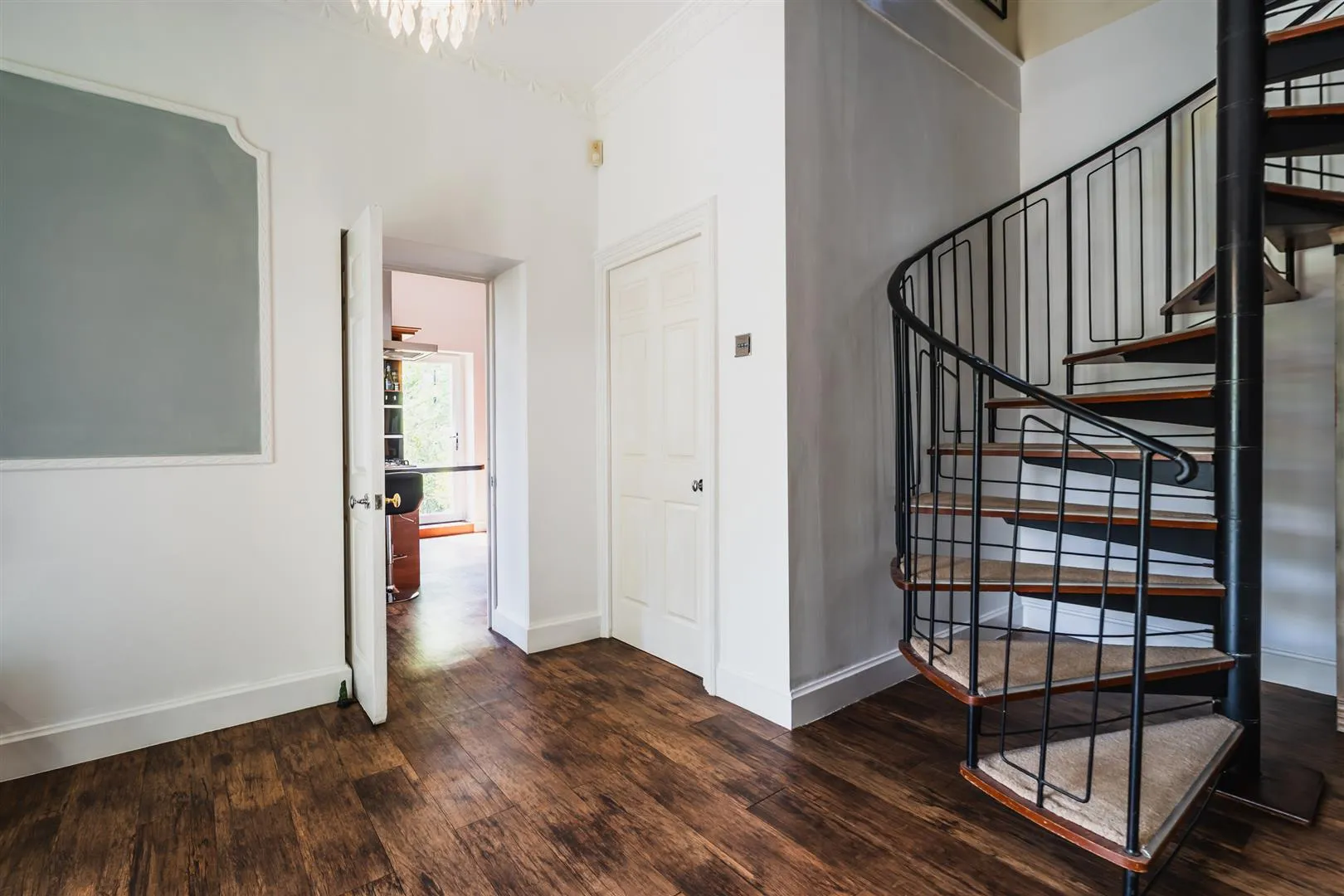 From the entrance hall, a wrought iron spiral staircase with balustrading and a timber hand rail rises to the: