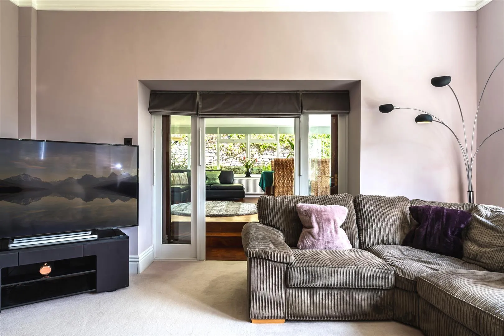 From the seating terrace, a wrought iron gate opens to a block paved path at the right side of the property, with a stone trough planter, and leads around to the rear of the property. Access can be gained to the conservatory.