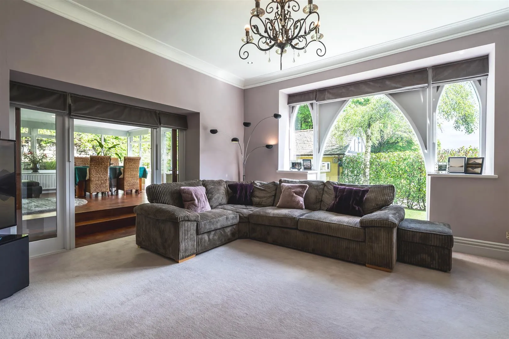 A light and spacious lounge with a large front facing feature double glazed arched panel and matching side panels. Also having a coved ceiling, pendant light point with a decorative ceiling rose, recessed lighting, central heating radiator and deep skirtings. The focal point of the room is the feature wall with a tiled timber effect front and an inset Celsi log effect electric fire. Double timber doors with glazed panels and matching side panels open to the conservatory.