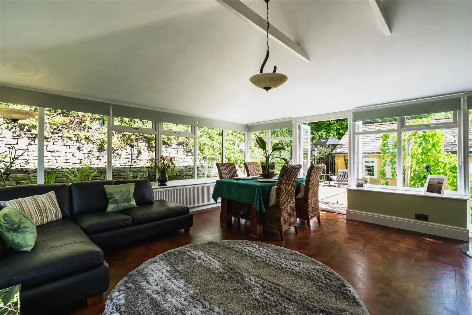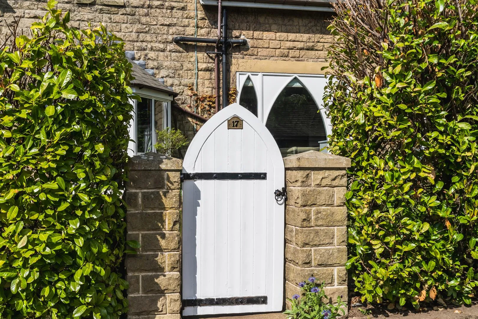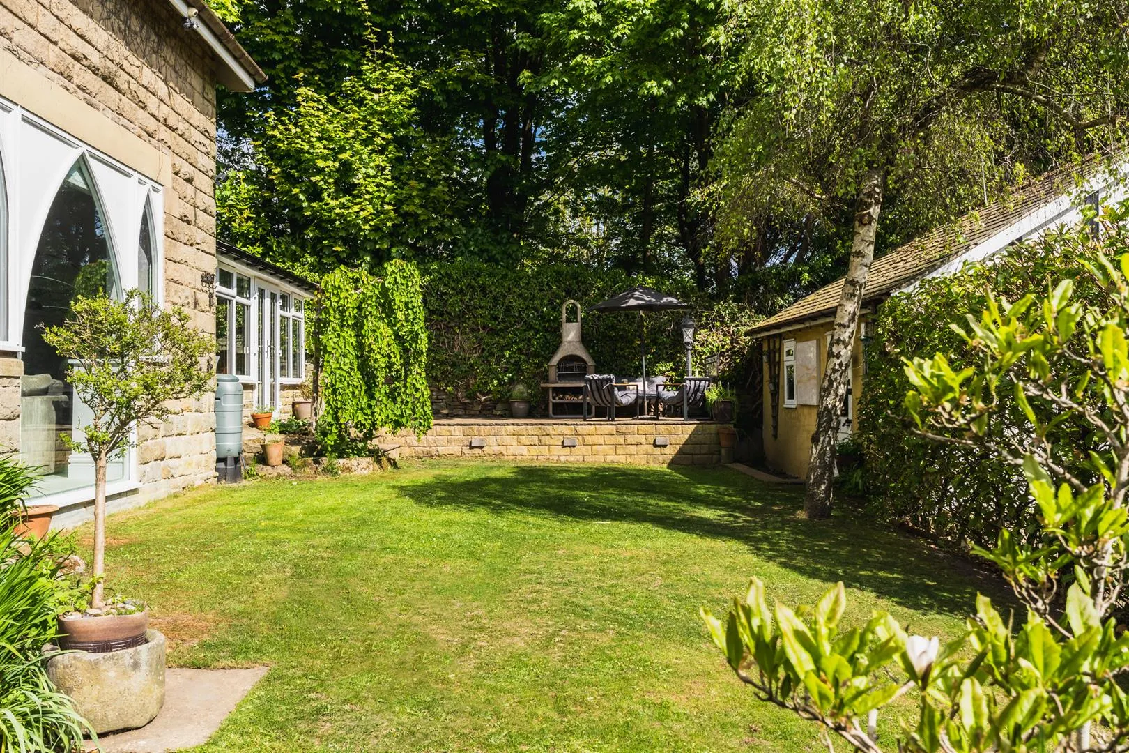 To the rear of the property, a stone flagged path provides access to the conservatory and a timber pedestrian gate opens to a further path that is flanked by gravel and has a water tap. The path wraps around to the left side of the property where there are mature shrubs and access can be gained to the breakfast kitchen. A wrought iron pedestrian gate opens to Moorside.
