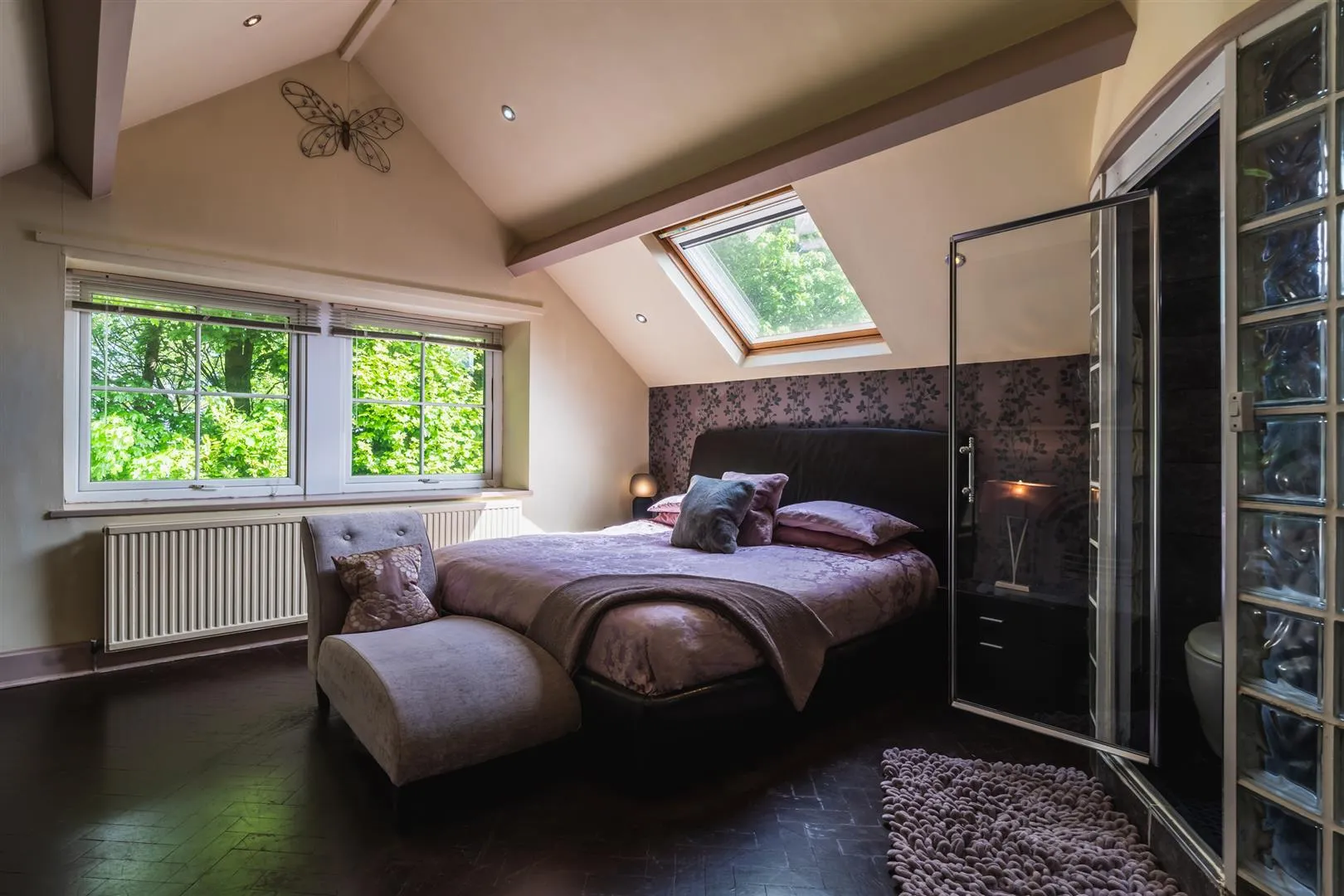 A quirky office space that provides a wonderful vantage point through the Velux roof windows of the far-reaching surrounding views. Also having exposed timber beams, flush light point, storage cupboard and timber effect flooring.