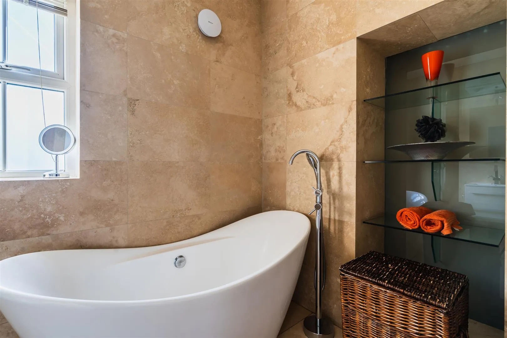 Being fully tiled in travertine with a front facing UPVC double glazed partially obscured window, recessed lighting, extractor fan, mirrored storage cabinet, glazed shelving and under floor heating. There’s a suite in white, which comprises of a low-level WC and a wall mounted wash hand basin with a chrome mixer tap and storage beneath. Also having a freestanding bath with a chrome mixer tap and a hand shower facility.