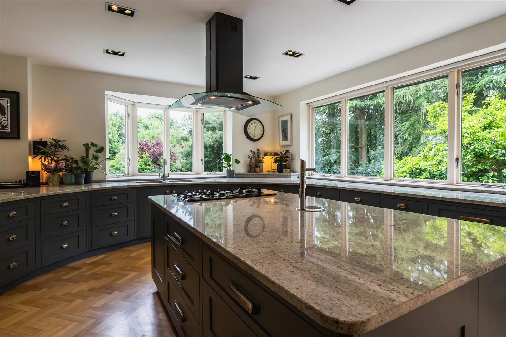 A stunning breakfast kitchen with bespoke cabinetry by My Fathers Heart, fitted with high-quality materials and appliances. Having a side facing timber triple glazed bay window, side facing triple double glazed window, recessed lighting and oak herringbone flooring with under floor heating. There is a comprehensive range of fitted base and drawer units, incorporating matching granite work surfaces, upstands and two inset 1.0 bowl Franke stainless steel sinks with a chrome mixer tap. The focal point of the breakfast kitchen is the sizeable central island, which provides additional storage and incorporates a matching granite work surface with a Zip Hydrotap that has the facilities for boiling and chilled water. The integrated appliances are by Siemens and include a four-ring gas hob with a wok burner and an extractor hood above, two Studioline fan assisted ovens, a Siemens warming drawer and a Siemens dishwasher. There is space/provision for a freestanding fridge/freezer. Double hardwood doors with double glazed panels open to the rear seating terrace. Two wide openings effortlessly connect to the living room.