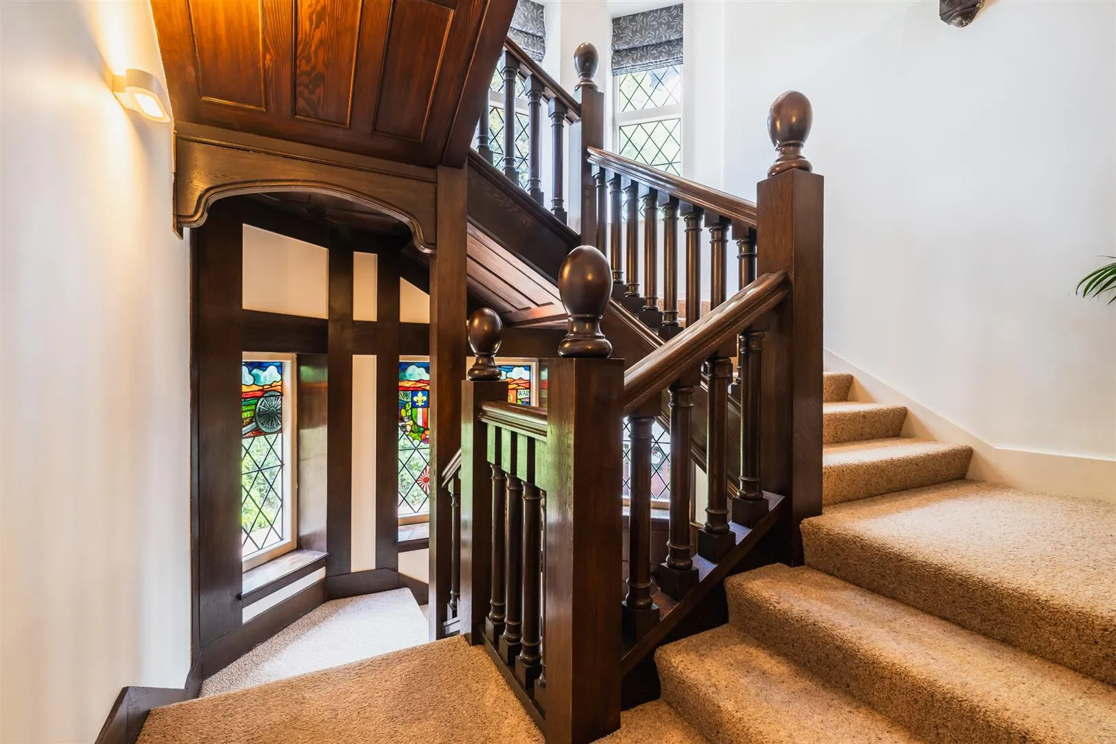 From the entrance hall, an impressive original staircase with double-width hand rails, heavy balustrading, front facing leaded glazed panels with stained glass and wall mounted light points rises to the: