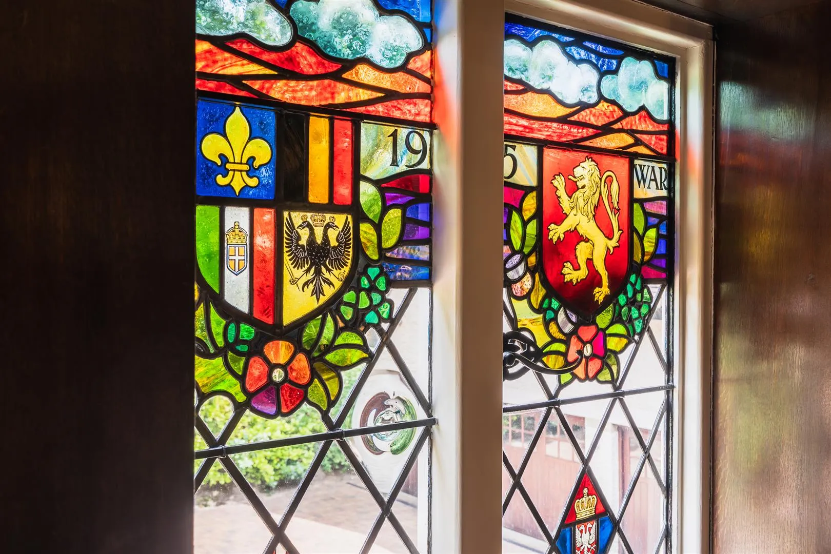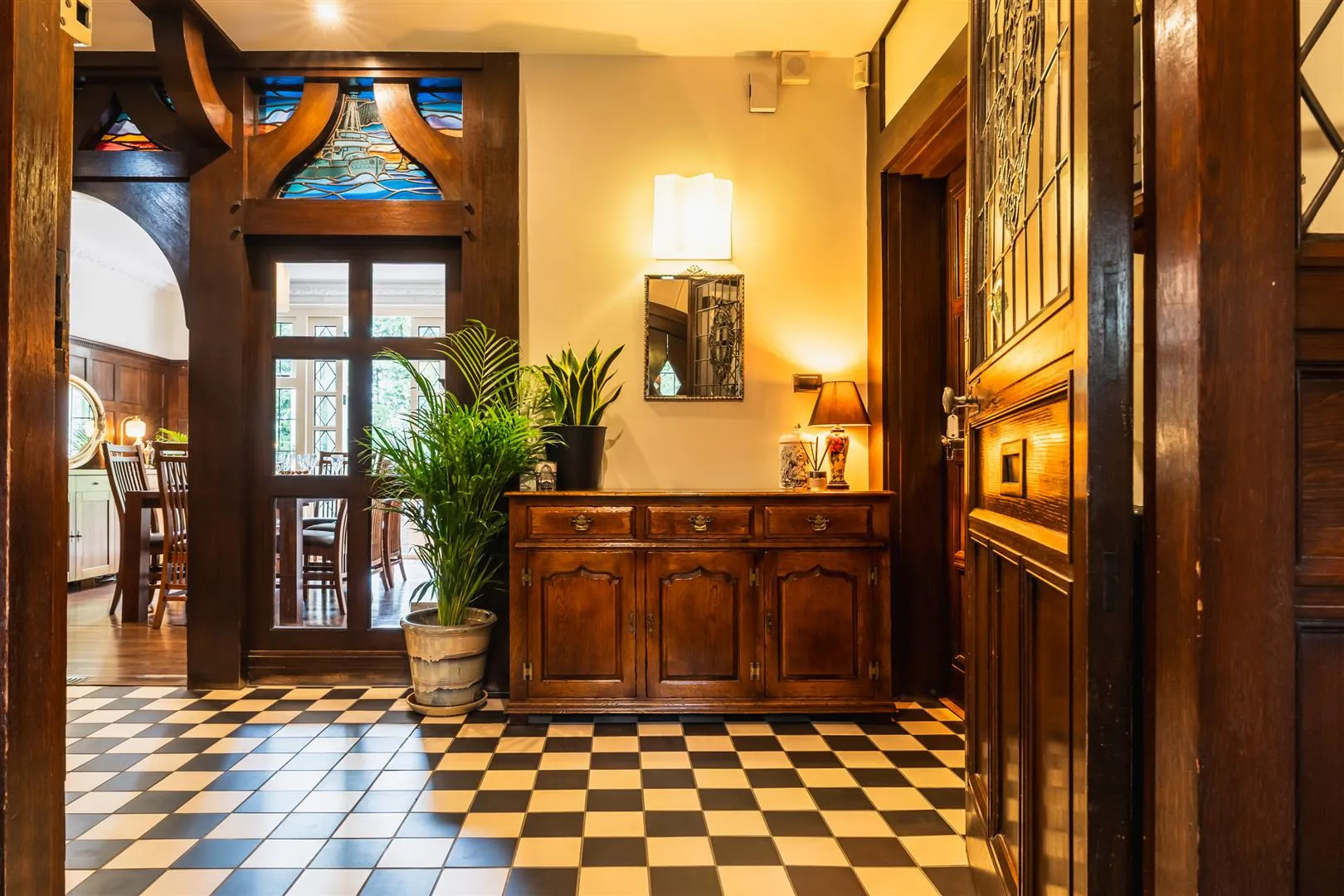 From the entrance hall, a door with obscured stained glass panels opens to the: