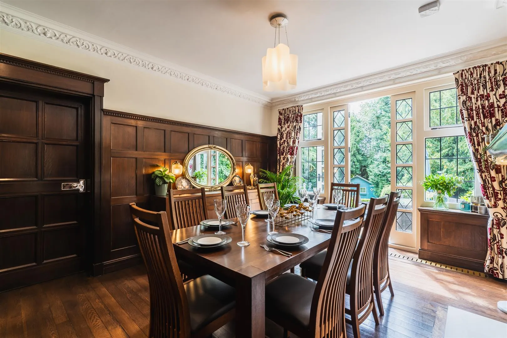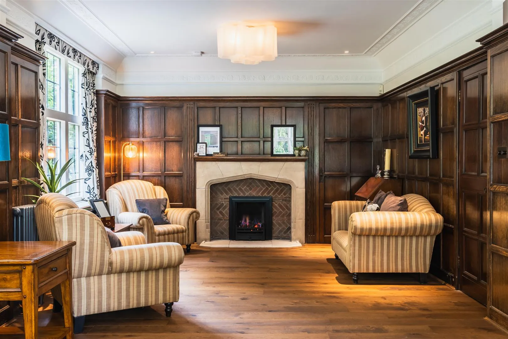 A grand reception room with side and rear facing timber triple glazed bay windows and a side facing timber triple glazed panel. There are decorative mouldings to the ceiling, flush light points, recessed lighting, oak panelling to the walls, central heating radiators, TV/aerial cabling and engineered oak flooring. The focal points of the room are the two coal effect gas fires, set beneath beautiful oak mantels with gritstone/brick surrounds and gritstone hearths. A door opens to the dining room.