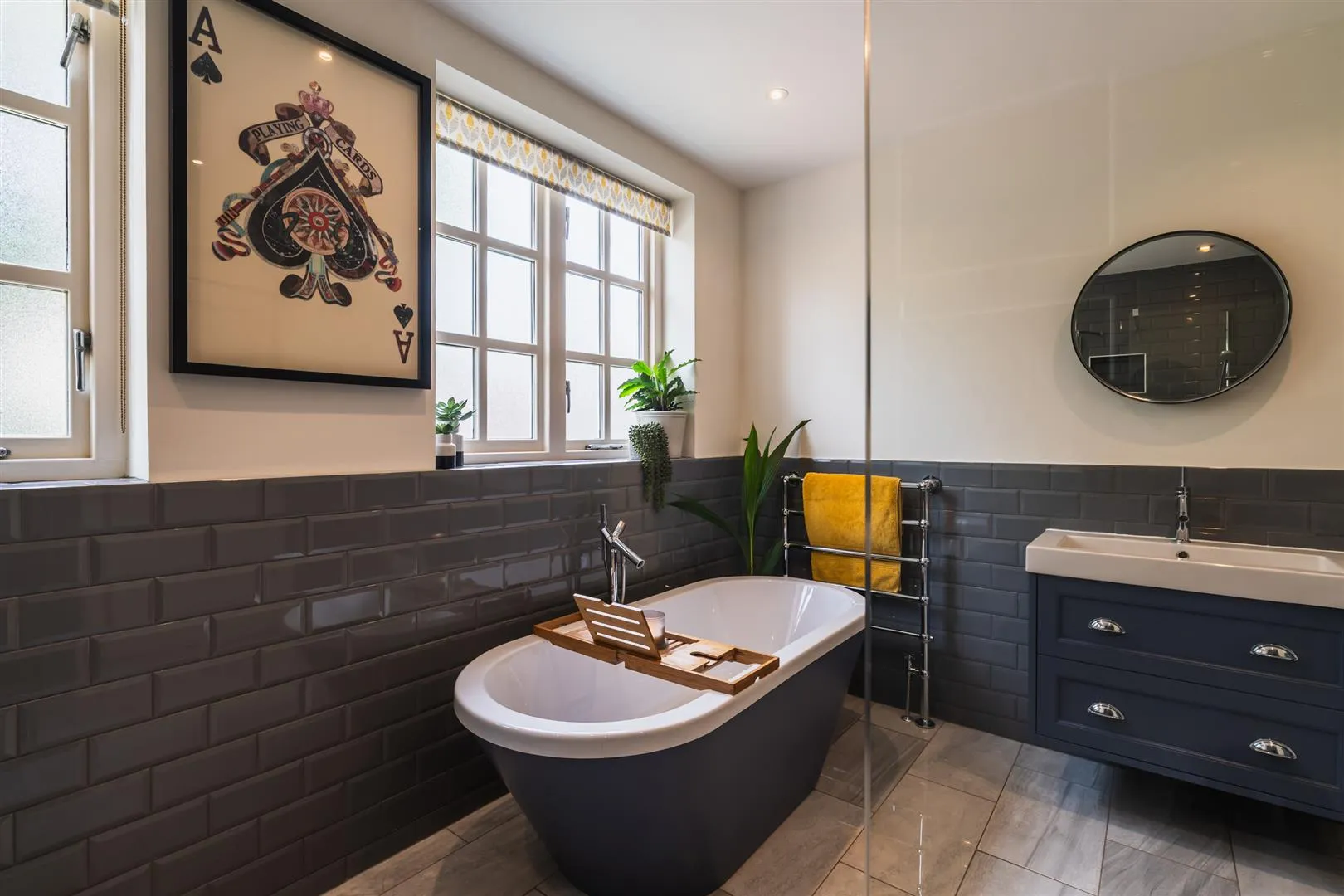 A relaxing sanctuary with front facing timber double glazed obscured windows, recessed lighting, extractor fan, partially tiled walls, chrome heated towel rail and tiled flooring with under floor heating. There is a suite, which comprises of wall mounted WC and a Utopia wash hand basin with an Axor Starck chrome mixer tap and storage beneath. Also having a freestanding bath with an Axor Starck chrome mixer tap and a hand shower facility. To one corner, is a walk-in shower enclosure with a recessed tiled shelves, a fitted Axor Starck shower and two glazed screens.