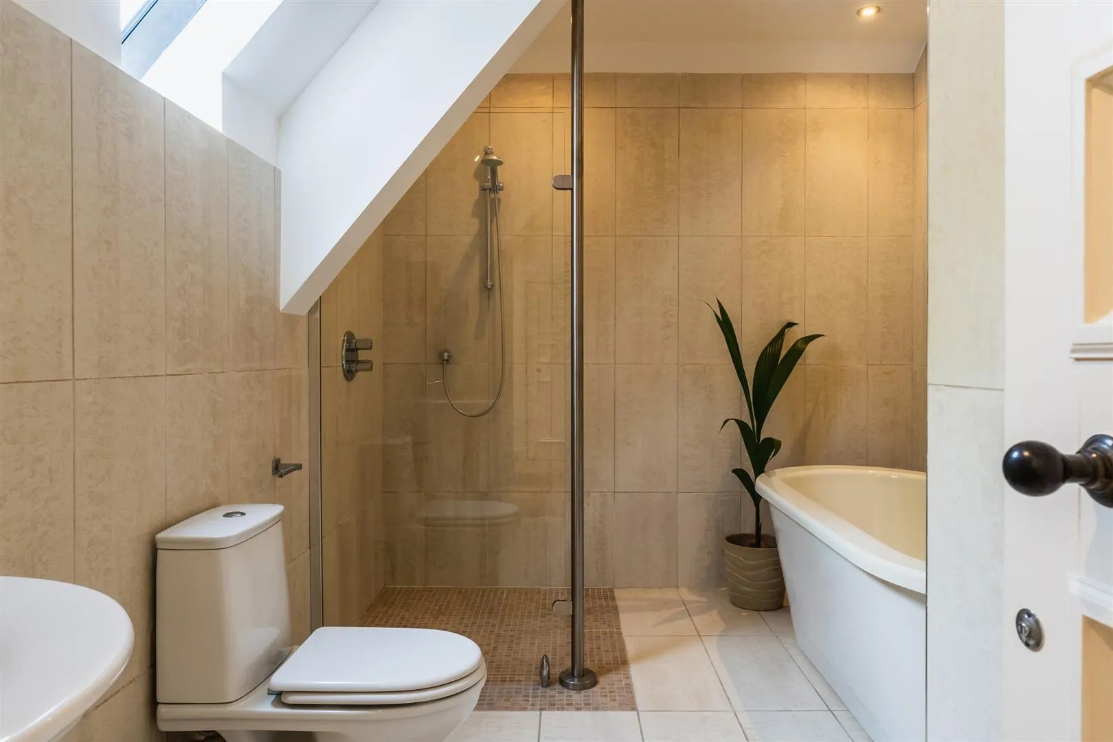 Being fully tiled and having a Velux roof window, recessed lighting, extractor fan, and a chrome heated towel rail. There is a suite in white, which comprises a low-level WC and a pedestal wash hand basin with a chrome mixer tap. Also having a freestanding bath with a chrome mixer tap and a hand shower facility. To one corner, there is a shower enclosure with a fitted Grohe shower and a glazed screen.