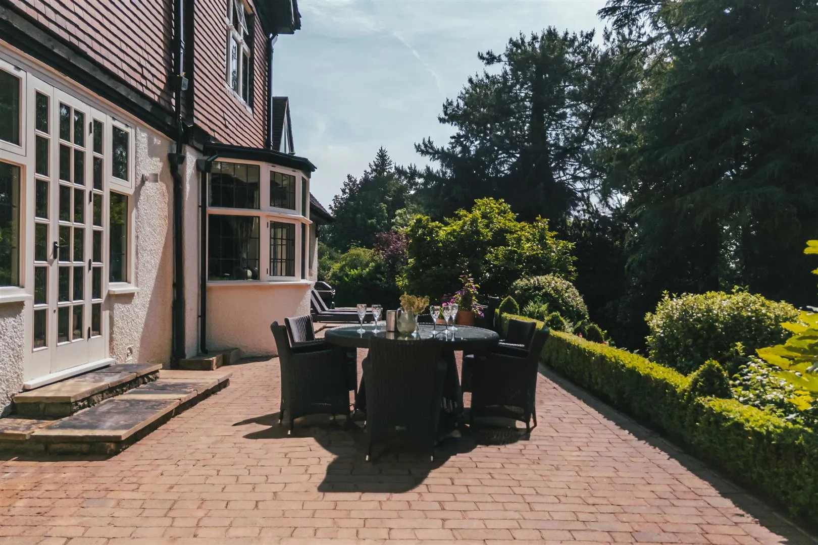 To the rear, is a pleasant block paved seating terrace, which benefits from a south-facing aspect and has exterior lighting and external power points. Access can be gained to the dining room and breakfast kitchen.