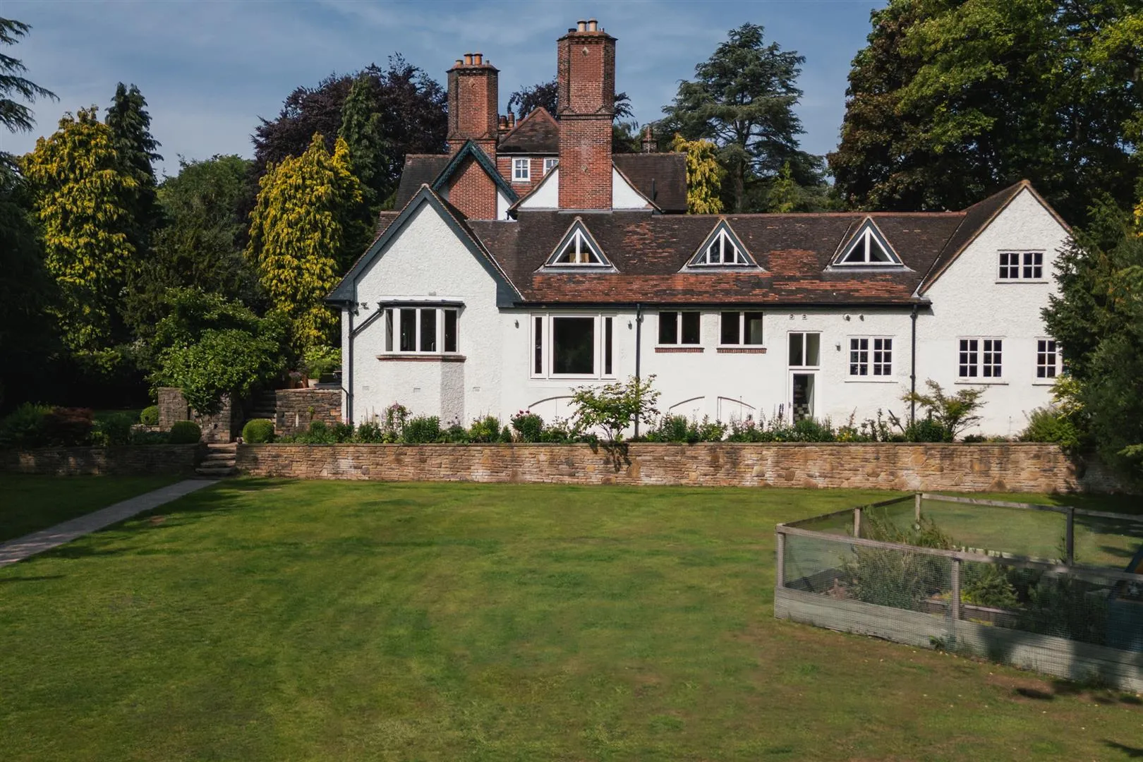 Beyond the path at the left side of the property, stone steps lead down to the formal garden, which is mainly laid to lawn and surrounded by dense borders populated by mature trees, shrubs and flowers.