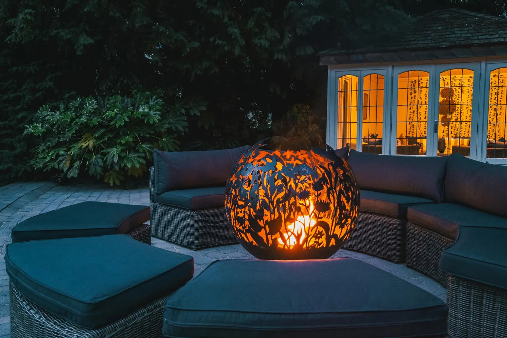 The path from the left side of the property continues to a block paved area that is ideal for storage and is separated into two by double wrought iron gates. An opening leads back to the front of the property. Stone steps also continue down to the formal garden. A gravelled path with stone edging leads through trees to a composting area and to the patio in the formal garden.