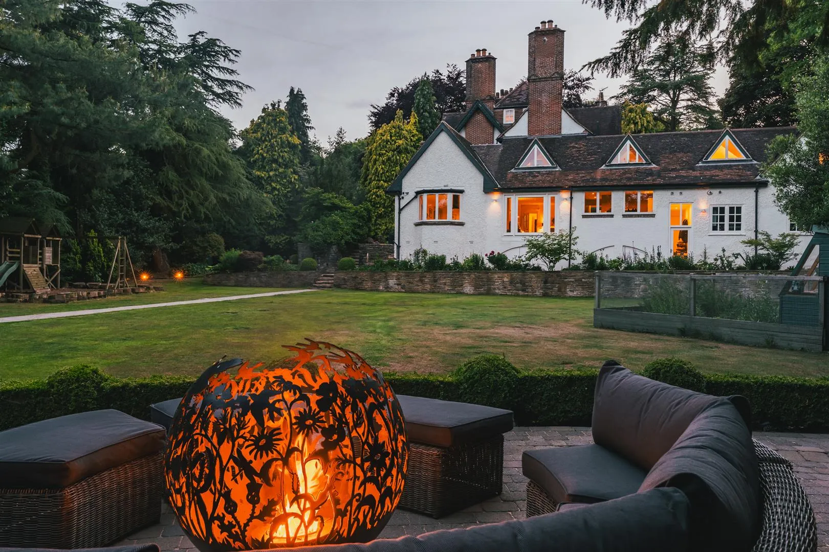 A block paved path meanders to one corner of the garden, where there is a lovely patio enclosed by ornamental hedging. Access can be gained to the summer house. There is also a fenced enclosure within the garden and a children’s play area.