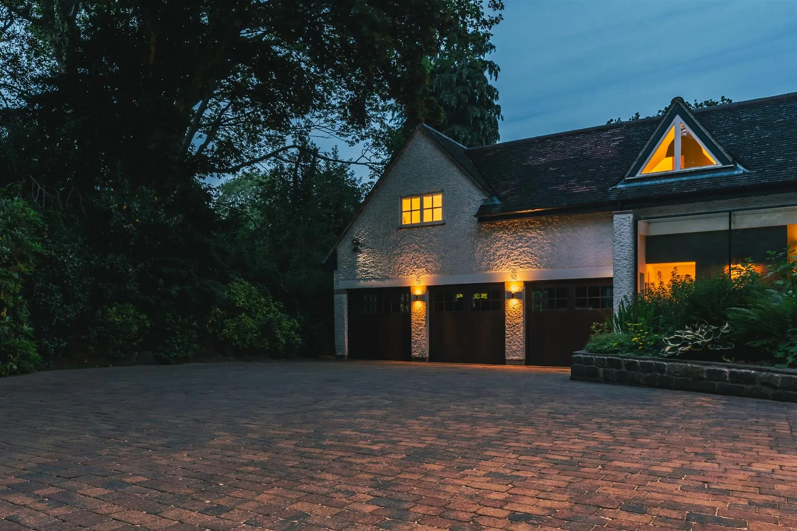 To the front, the block paved driveway provides extensive parking for several vehicles and has exterior lighting, a rockery border with trees and shrubs and a large, raised stone planter containing specimen planting. Access can be gained to the main entrance door, secondary entrance hall and integral triple garage.