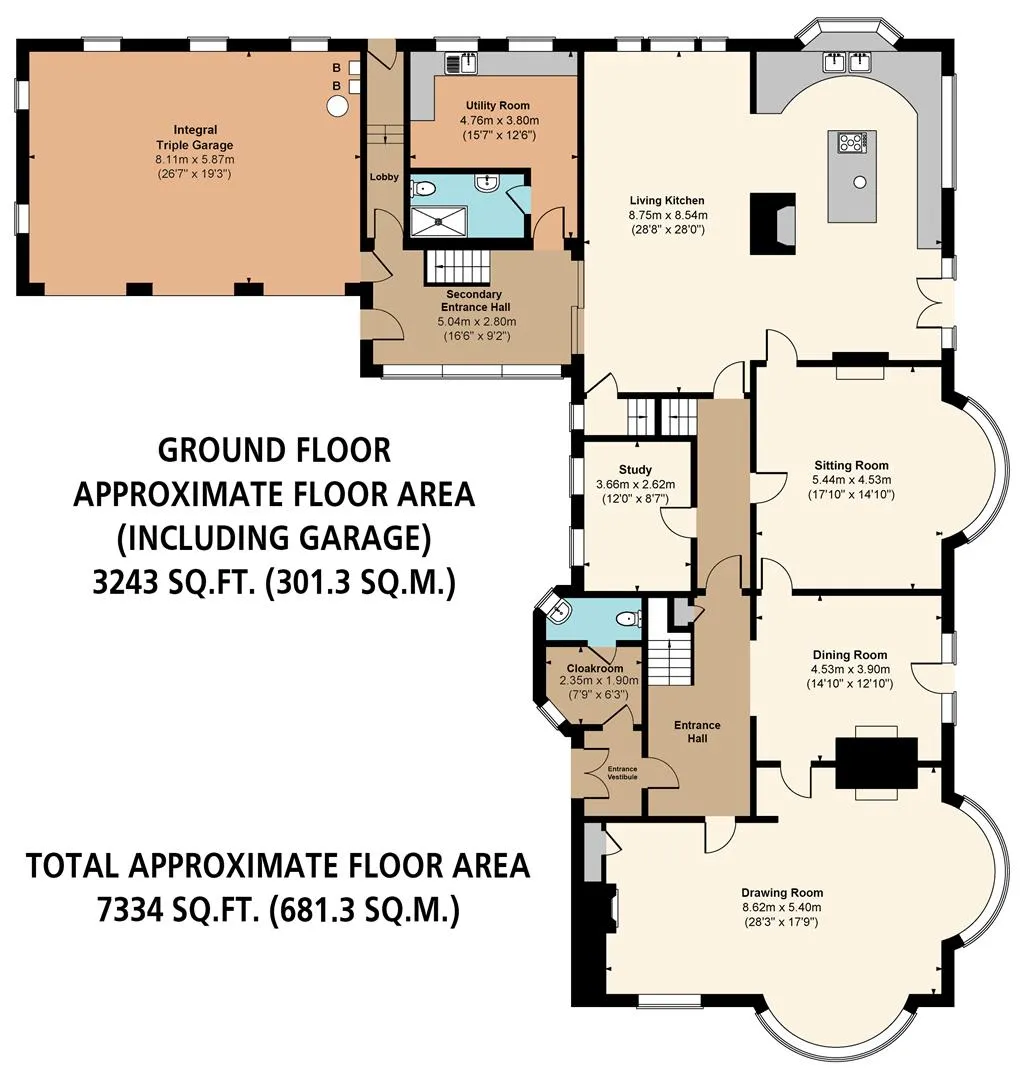 The property briefly comprises of on the ground floor: Entrance vestibule, cloakroom, WC, entrance hall, drawing room, dining room, hallway, study, sitting room, living kitchen, stairway to basement level, secondary entrance hall, utility room, wet room, integral triple garage and lobby.