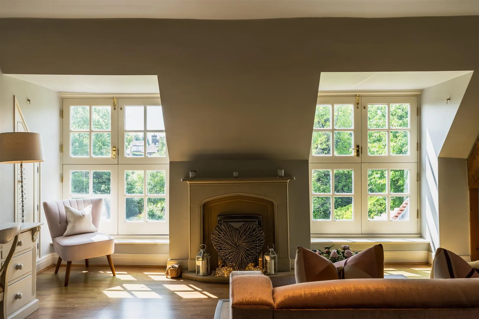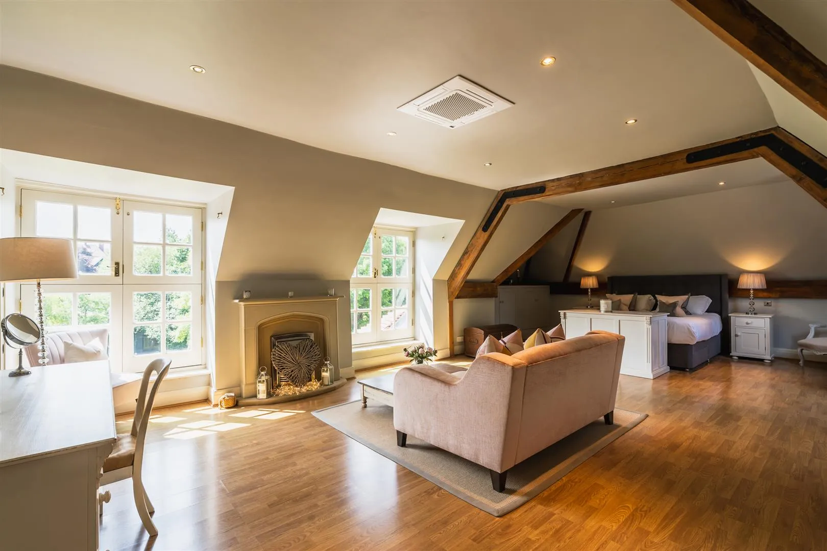 A sumptuous master bedroom suite of grand proportions. Featuring exposed timber beams and two sets of front facing, double timber stable-style doors with double glazed panels, which overlook the front garden. Also having a Velux roof window, recessed lighting, Mitsubishi air conditioning unit, central heating radiators and timber effect flooring. The focal point of the room is the coal effect gas fire with a stone mantel, surround and hearth. There is a range of fitted storage, incorporating short hanging and shelving. A timber door opens to the master dressing room. Access can also be gained to a loft space.