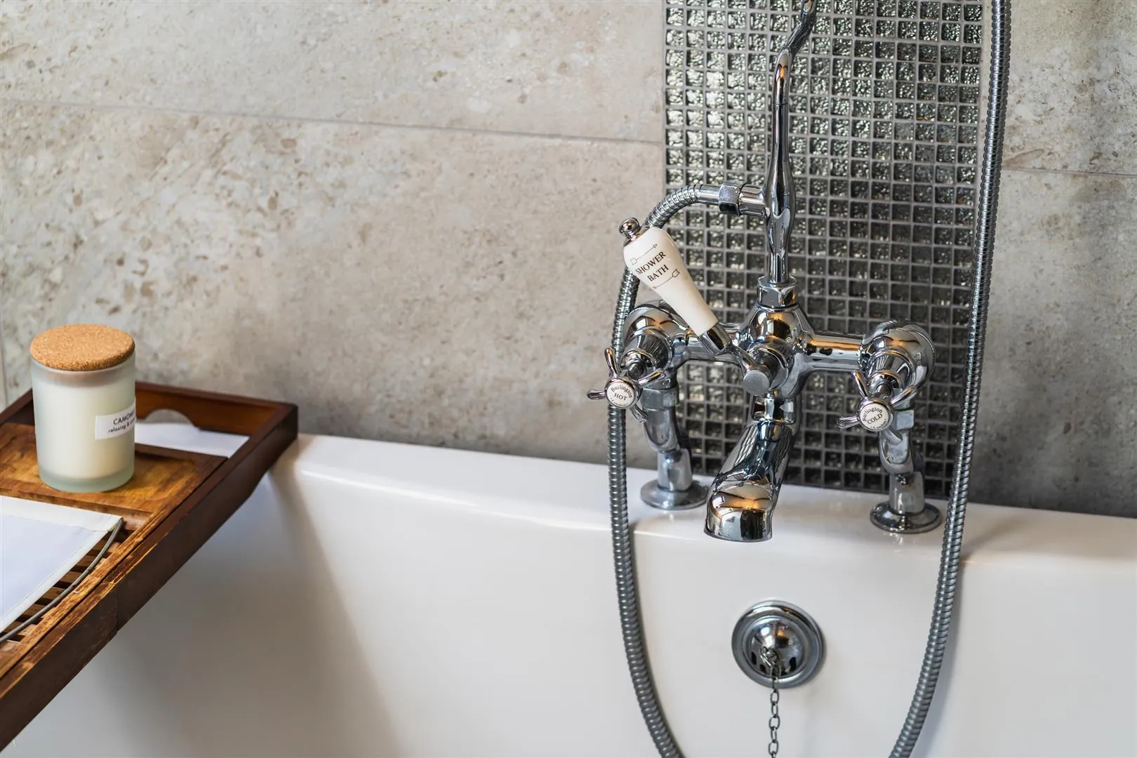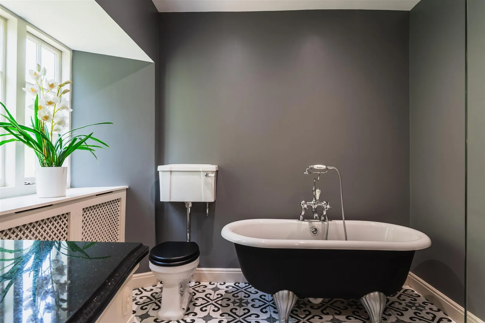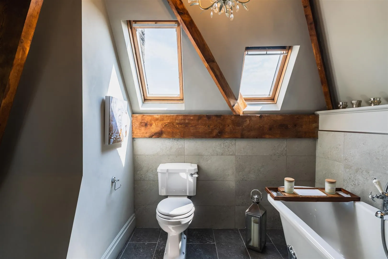 A sanctuary for relaxation, the en-suite bathroom has Velux roof windows, exposed timber beams, recessed lighting, pendant light point and partially tiled walls. Also having an illuminated vanity mirror, chrome heated towel rail, shaver point and tiled flooring with under floor heating. There is a suite in white, which comprises a low-level WC and a vanity unit, incorporating a granite work surface, an inset Burlington wash hand basin with a chrome mixer tap and storage beneath. The centre point of the bathroom is the freestanding roll top bath with a Burlington chrome mixer tap and a hand shower facility. To one corner, is a shower enclosure with a fitted Aqualisa rain head shower and a glazed screen/door.