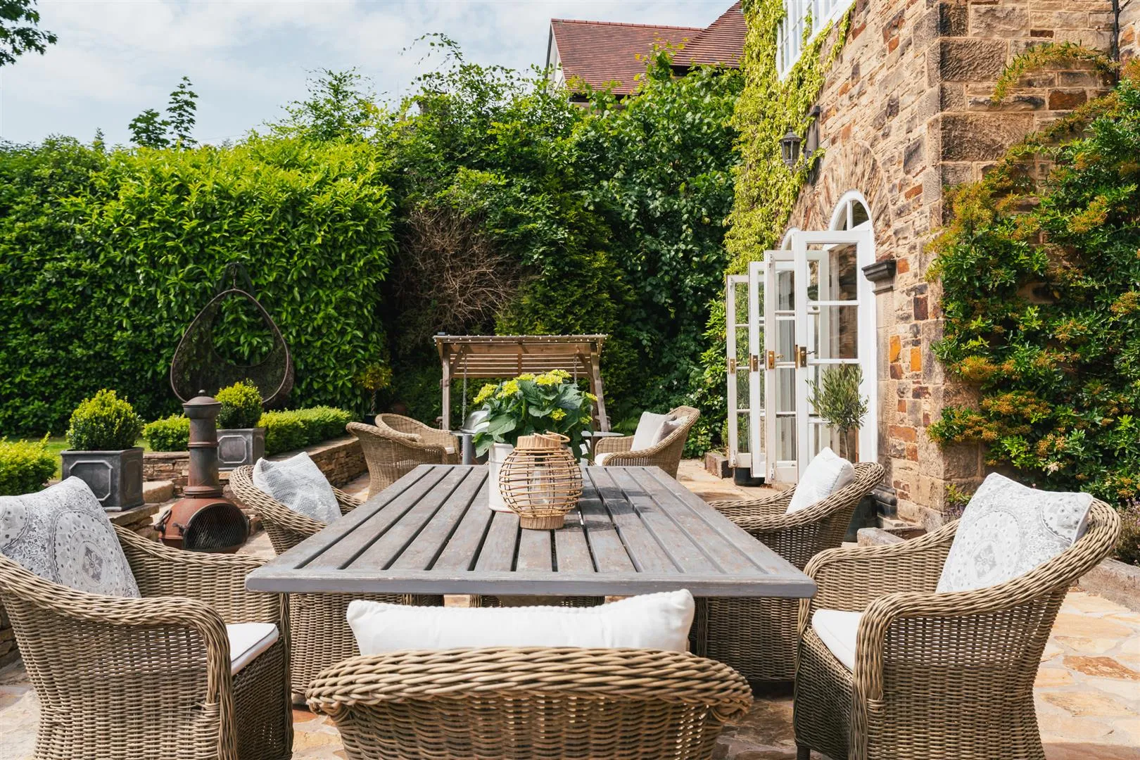 From the driveway, a wide opening leads to a stone flagged seating terrace, which presents the perfect spot for enjoying the sunshine due to its south-facing aspect. The terrace has exterior lighting and timber sleeper borders planted with lavender. Access can be gained to the lounge.