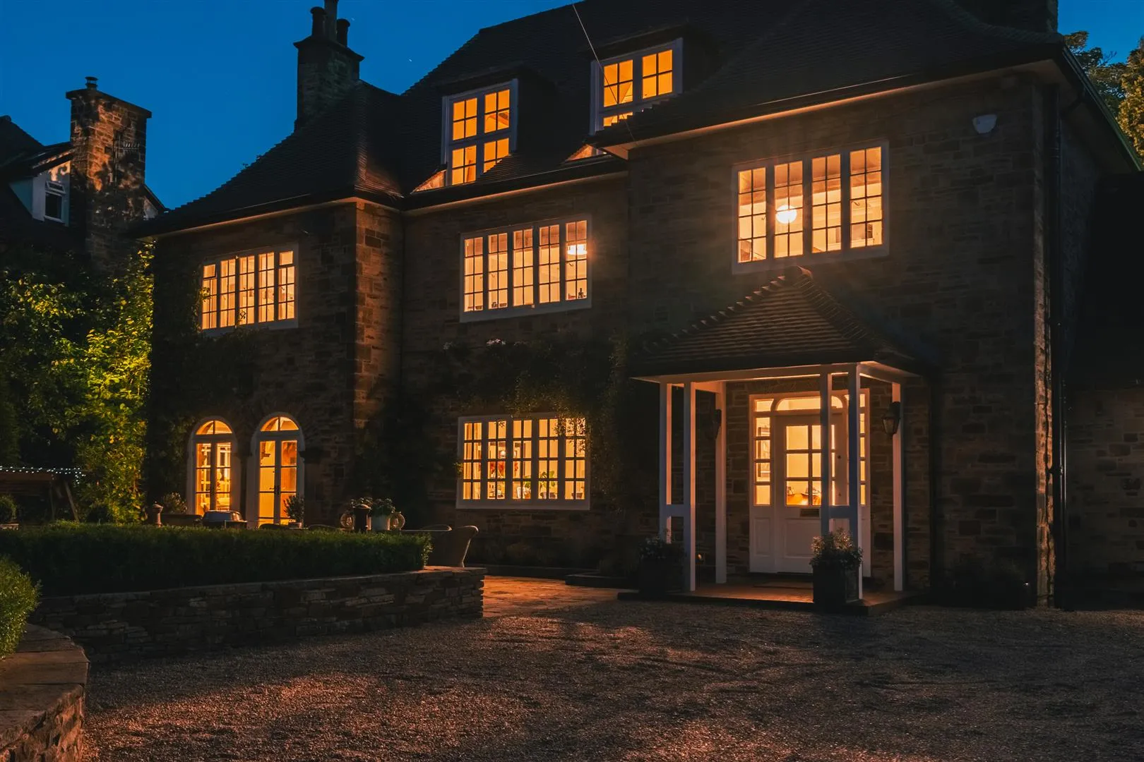 Machan Croft is accessed from Sefton Road, where intercom operated electric gates open to a long driveway, which is flanked by mature hedging and up-lighters. The driveway connects to the front of the property, where there is a substantial gravelled parking area for several cars with exterior lighting and up-lighters. Access can be gained to the integral garage and the entrance canopy, comprising exterior lighting and the main entrance door.
