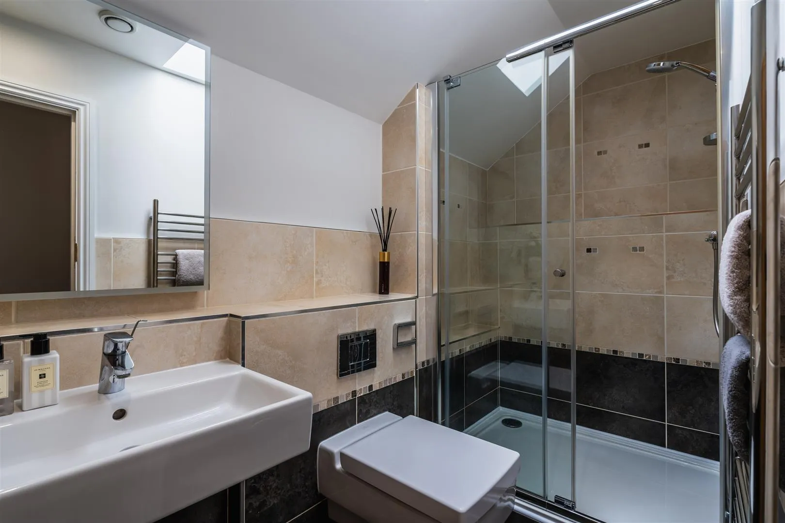 Having a glazed roof panel, recessed lighting, extractor fan, partially tiled walls, shaver point, chrome heated towel rail and tiled flooring with under floor heating. The suite in white comprises a low-level WC and a wash hand basin with a chrome mixer tap. There is a panelled bath with a chrome mixer tap and an additional hand shower facility. To one corner is a separate shower enclosure with a rain head shower, an additional hand shower facility and a glazed screen/door.