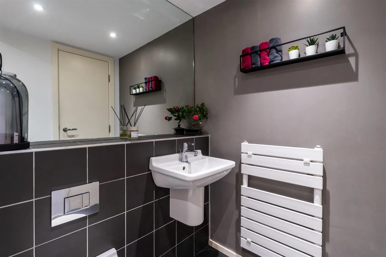With recessed lighting, extractor fan, heated towel rail and Amtico flooring. There is a suite in white comprising a wall mounted WC and a wash hand basin with a chrome mixer tap. A timber door opens to the storage cupboard.