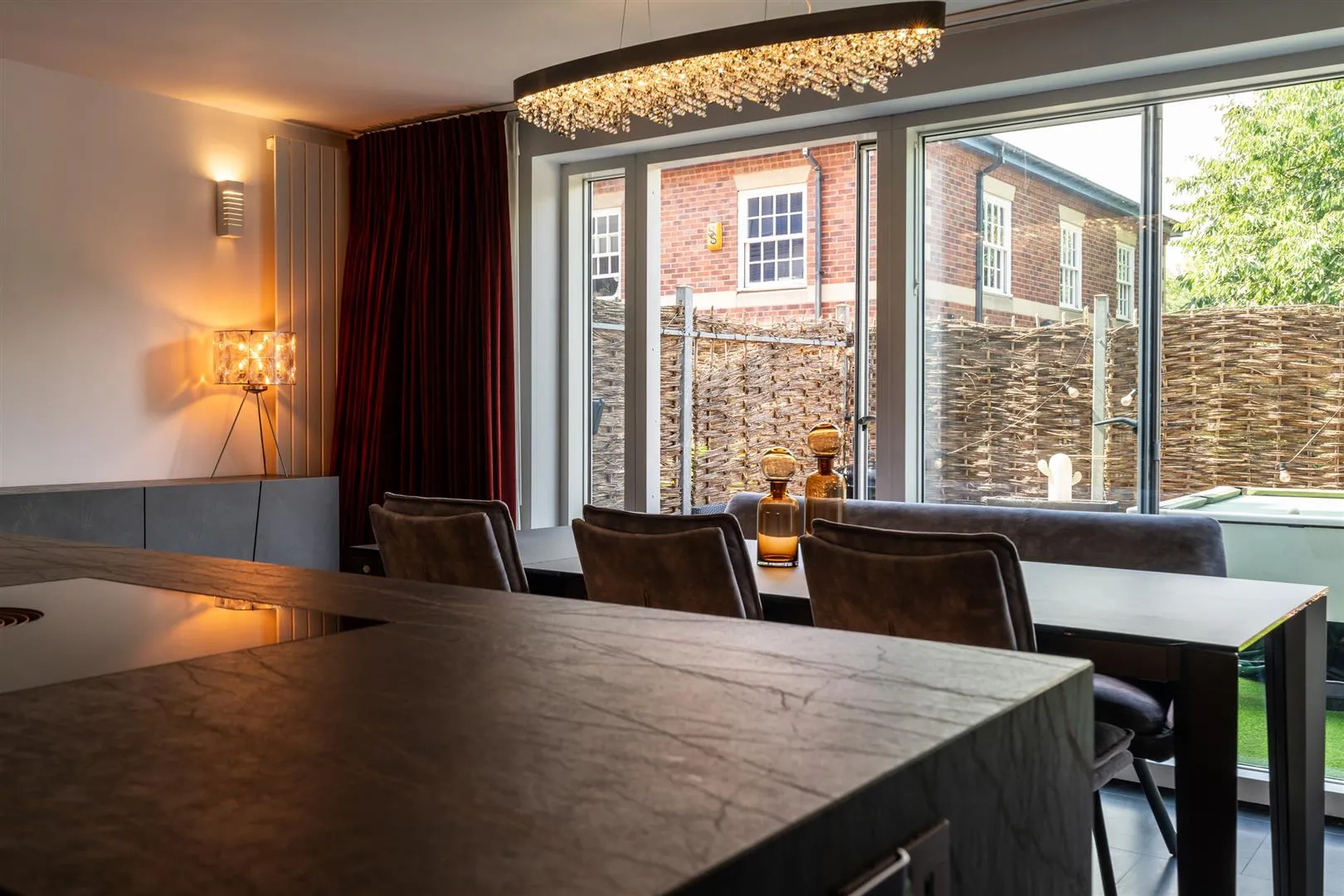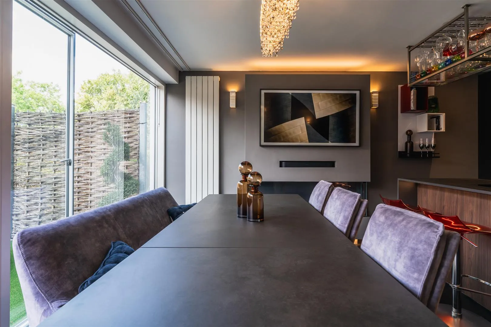 A well-appointed breakfast kitchen that has a rear facing UPVC double glazed panel, pendant light point, wall mounted light points, central heating radiator, TV/aerial point and tiled flooring. The focal point of the room is the decorative electric fireplace. There are a range of fitted base/wall and drawer units with a Dekton work surface, under-counter lighting and an inset 1.0 bowl sink with a Quooker boiling water tap and Insinkerator waste disposal. Appliances include a full-height fridge freezer, Fisher and Paykel steam oven, combination microwave oven, and an integrated Bosch Coffee Machine. There is a separate central island with a matching Dekton work surface that has a BORA four-ring induction hob with an integrated extractor vent. A UPVC door with a double glazed panel opens to the rear of the property.