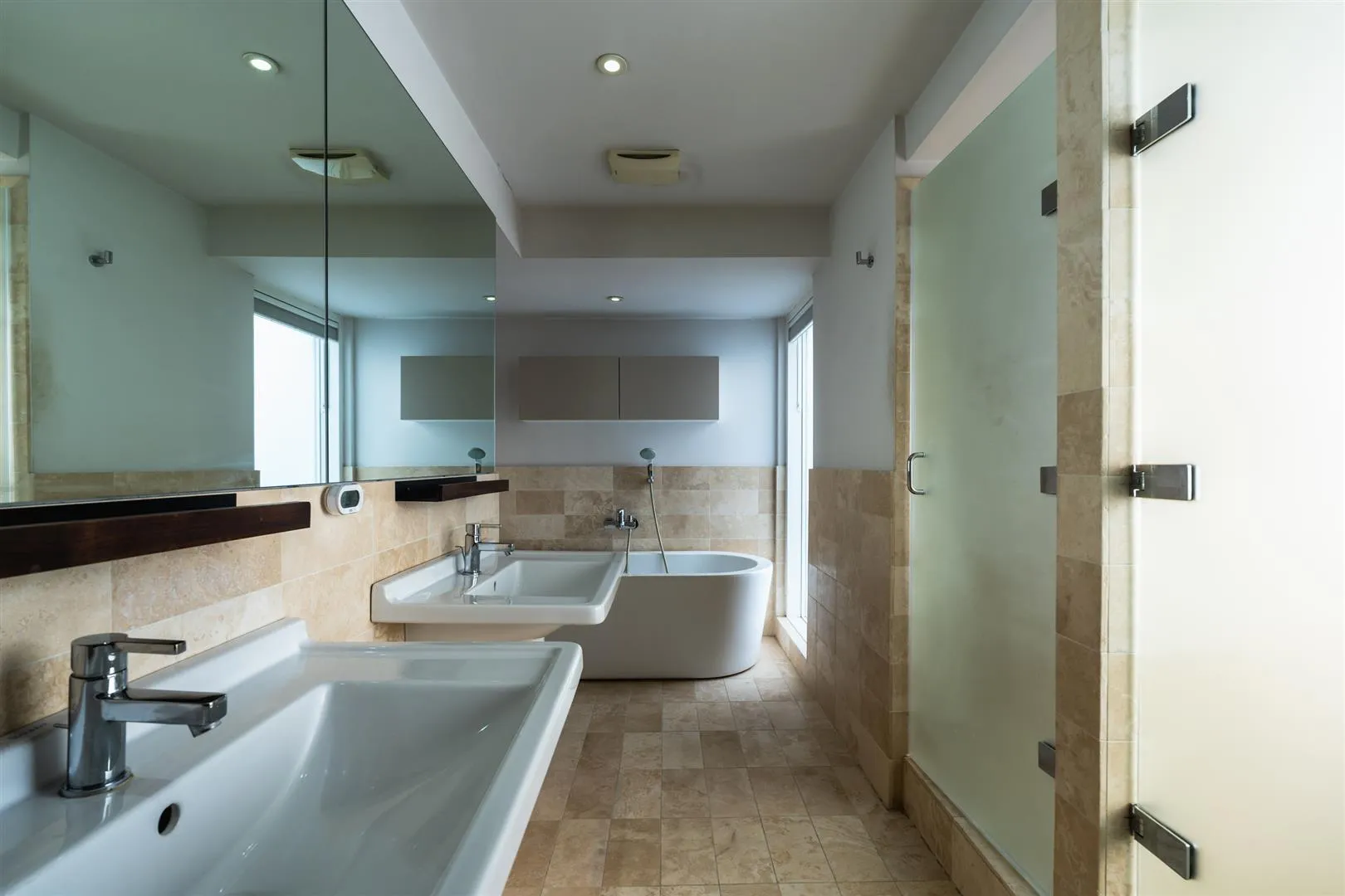 Having a front facing UPVC double glazed obscured panel, recessed lighting, central heating radiator and tiled flooring. There is a Philippe Starck/Duravit suite with Hansgrohe fittings, comprising of two wash hand basins with chrome mixer taps and a freestanding bath with a chrome mixer tap. Two glazed obscured doors open to the shower room and WC.