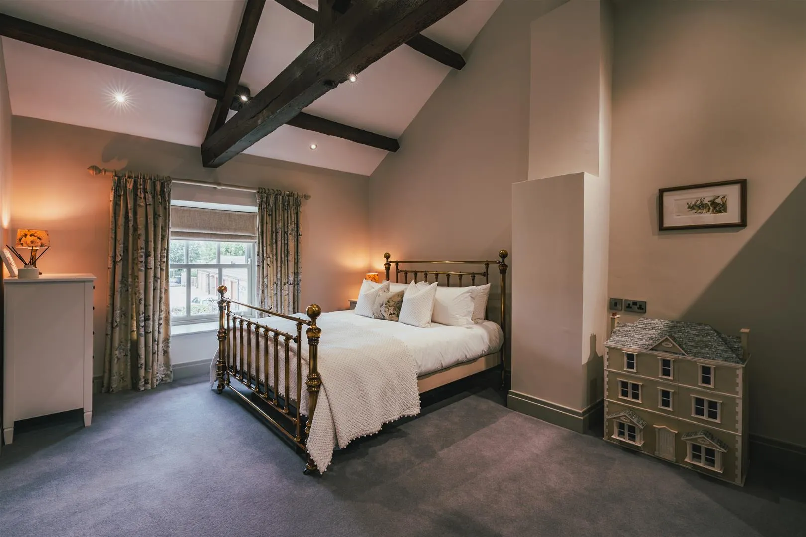 A fabulous bedroom suite featuring a Juliet balcony overlooking the gardens. The bedroom has a front facing hardwood double glazed sash window, vaulted ceiling with exposed timber beams, spotlighting, recessed lighting, central heating radiators and timber effect flooring. A hardwood door with a double glazed panel opens to the Juliet balcony, which has a wrought iron balustrade. A hardwood door also opens to the bedroom 2 en-suite shower room.