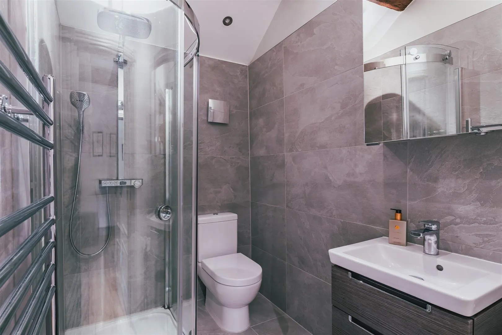 Being fully tiled and having a vaulted ceiling with an exposed timber beam, recessed lighting, extractor fan and a chrome heated towel rail. There is a Villeroy & Boch suite in white, which comprises a low-level WC and a wash hand basin with a Villeroy & Boch chrome mixer tap, an illuminated mirrored cabinet above and storage beneath. To one corner, there is a shower enclosure with a fitted Hansgrohe rain head shower, an additional hand shower facility and a glazed screen/door.